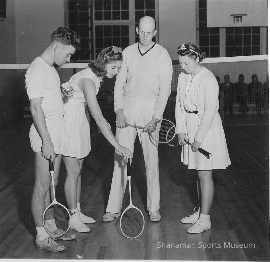 Lyle Morton (second from right) gets his picture taken with three other badminton players. Morton watches on as one player tries to balance her badminton racket. Morton was a longtime supporter of sports in Tacoma. He coached tennis at the University of Puget Sound in the early 1960s.