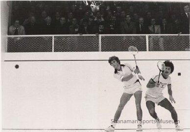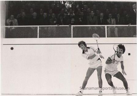 Photograph, b/w, original. L-R: Jay Gillespie, Mark Alger on squash court, US National Squash Tournament, Detroit, MI March 1981. Copy print on file. Badminton?Lexicon