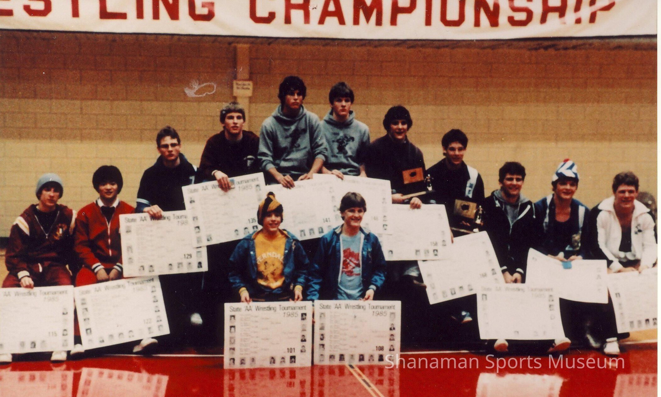 Photograph, color, original. 13 wrestlers pose with tournament posters. 1985 State AA Wrestling Championship, Spokane. Brothers Jeff Gotcher and Larry Gotcher are on #1 stand (grey sweatshirts).Lexicon