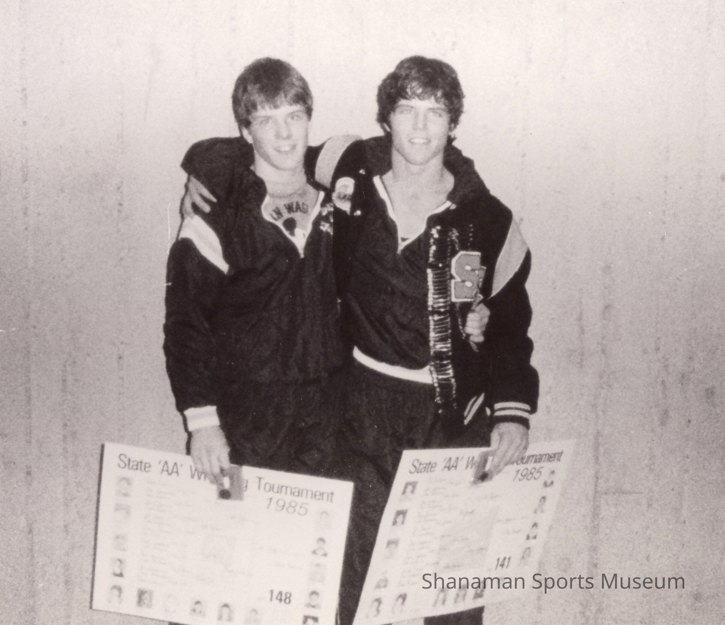 Photograph, b/w, copy print. (L-R): Jeff Gotcher and Larry Gotcher pose with 1985 State AA Wrestling Championship posters, Spokane.Lexicon