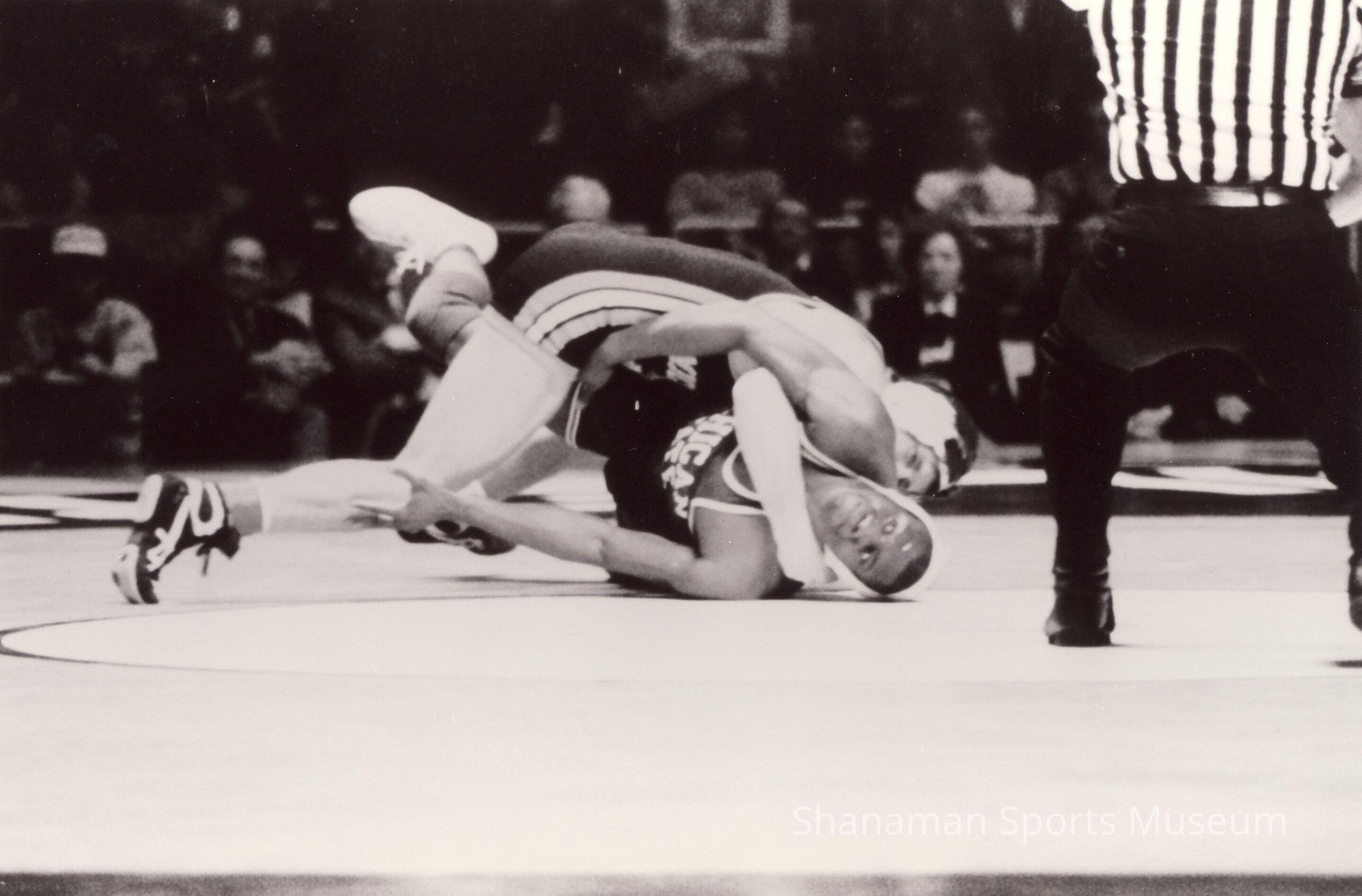 Photograph, b/w, copy print. Larry Gotcher of Michigan (top) and Stacey Richmond of Michigan State (bottom) wrestle at 1989 Big Ten Final match. Gotcher prevailed 10-3 to win the NCAA championship.Lexicon