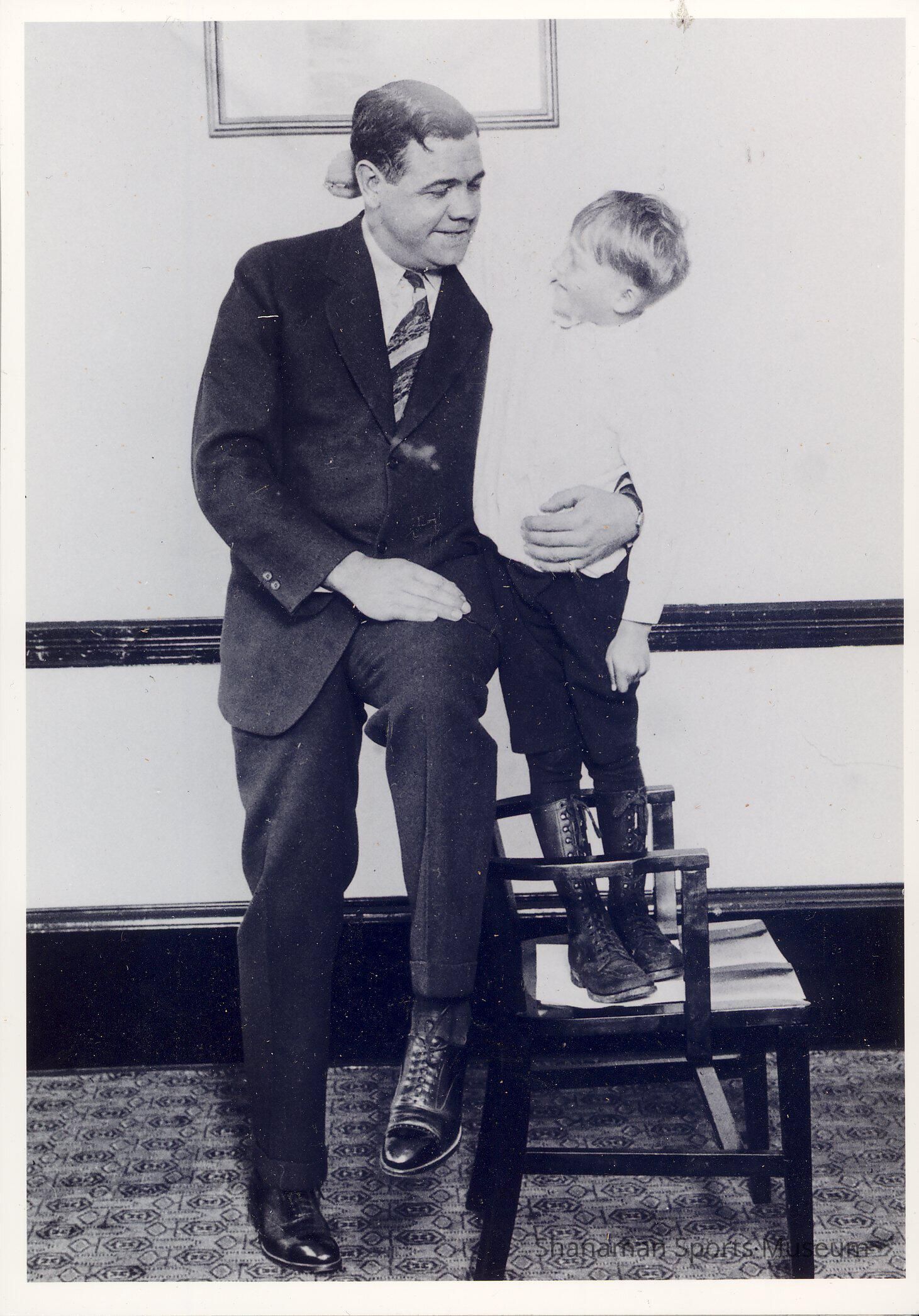 Photograph, b/w, original. Babe Ruth and David Metcalf. Metcalf stands on chair, Ruth perched on chair back, their arms around each other. Back of photo inscribed in pencil: "My baby, David, and Babe Ruth - 1926"Relationships