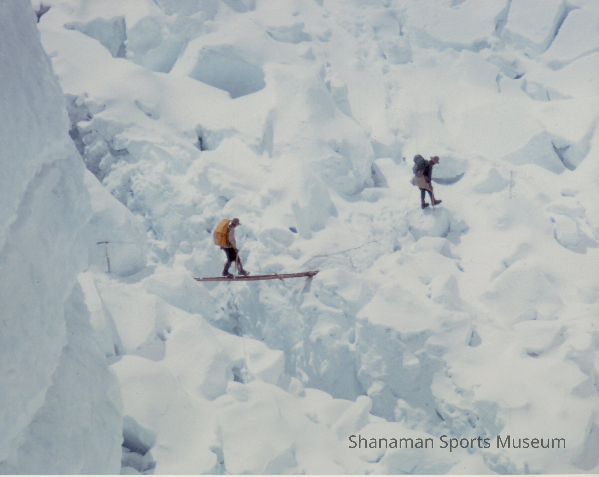 Using a rope and a bridge fashioned from a ladder, two climbers cross a crevasse in this image donated by Susan Jerstad. She is the wife of Lute Jerstad, the first Pierce County resident to climb Mount Everest. Jerstad summited the world's highest peak in 1963 as part of the first American team to accomplish the feat. Jerstad was a graduate of Peninsula High and Pacific Lutheran University. He played baseball, basketball and football at Peninsula and basketball at PLU. He also earned degrees from Washington State University and the University of Oregon. He taught briefly at Franklin Pierce High School near Tacoma. He died of a heart attack while climbing Mount Kala Pattar in the Himalayas in 1998.Lexicon