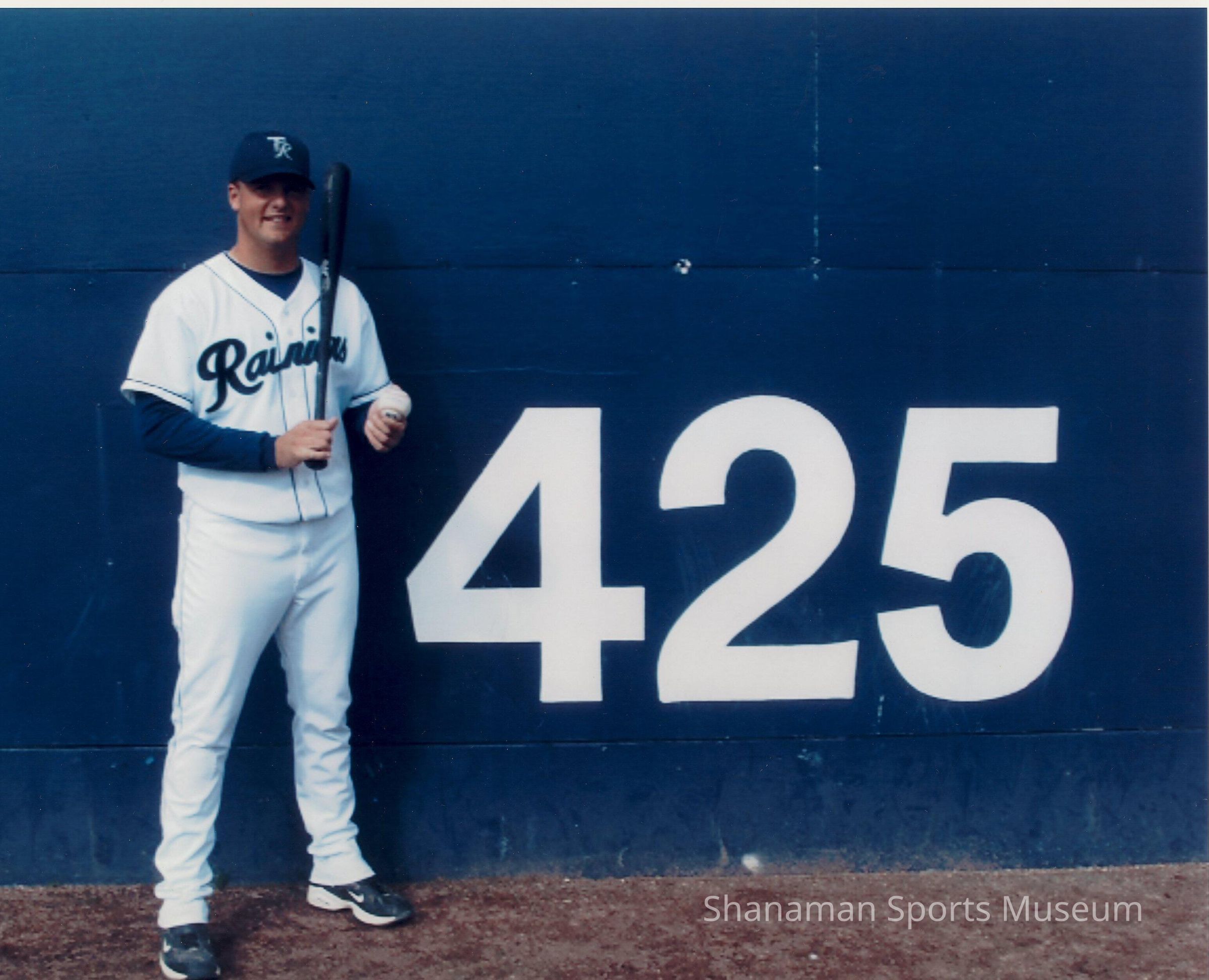 AJ Zapp stands by the 425-foot marker at center field in Cheney Stadium. Zapp is the first player to belt a home run over the 29-foot high wall. Zapp smacked his long-ball homer in 2004, 44 years after Cheney Stadium opened.Made/Created