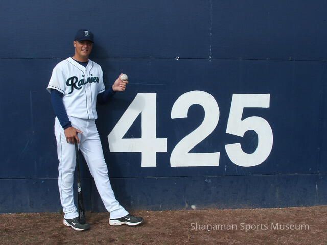 First baseman AJ Zapp stands in the parking lot at Cheney Stadium where his home-run blast landed. Zapp became the first one to smash a home run over the center field wall in the history of Cheney Stadium. Zapp belted his record homer in 2004 and the stadium was built in 1960.Made/Created