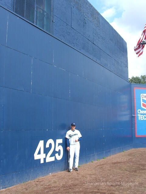 Tacoma Rainier first baseman AJ Zapp stands by the 425-foot marker on the center field wall at Cheney Stadium. In 2004, Zapp became the first batter to smash a home run ball over the 29-foot high centerfield wall. Former Rainier manager Dan Rohn had said it couldn't be done.Made/Created