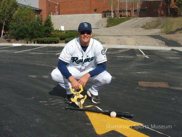 A.J. Zapp, who played 136 games for the Tacoma Rainiers during the 2004 Pacific Coast League season, poses with a measuring tape, bat and baseball in the parking lot of Cheney Stadium.