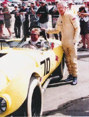 Wearing a yellow racing suit, Pete Lovely stands next to his race car. Lovely's racing career lasted for more than 50 years. He began racing in the late 1950s and continued to participate in Vintage and historic events until the early 2000s. Lovely won his first race in 1957 driving a Ferrari.Lexicon