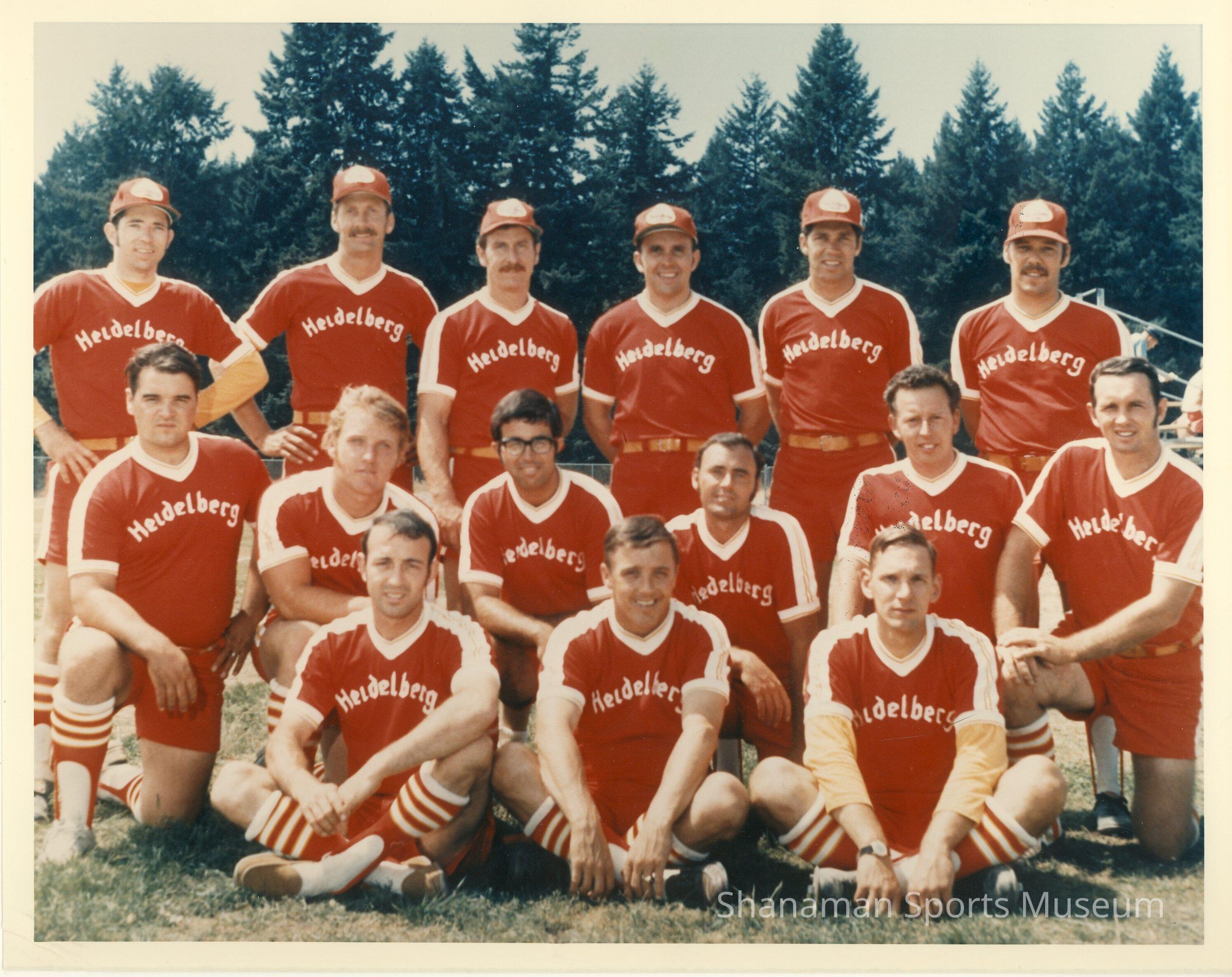 Fifteen members of the Heidelberg men's softball squad pose for an undated team photograph.