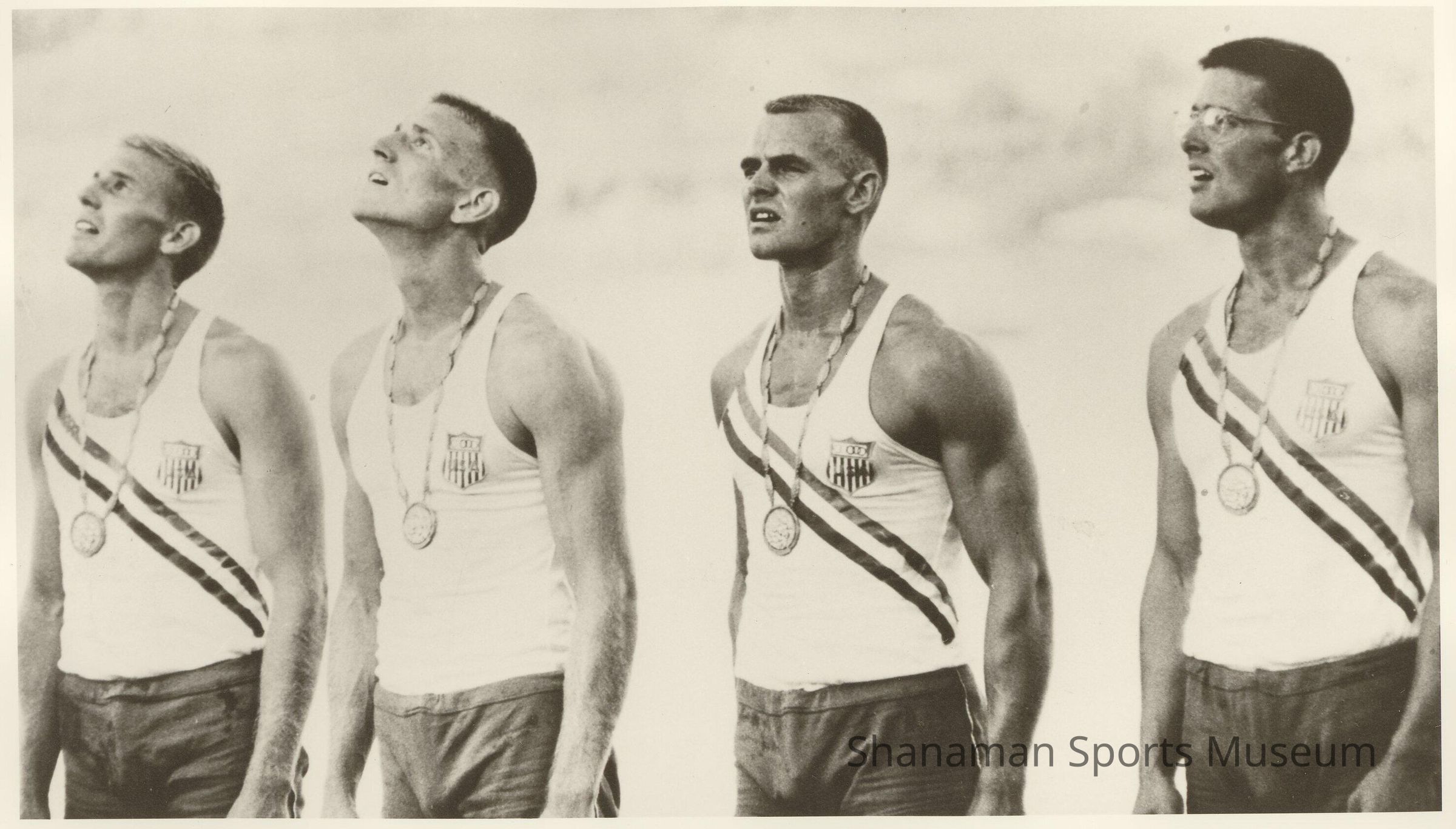 From left, John Sayre, Rusty Wailes, Ted Nash, and Dan Ayrault stand during the gold medal presentation at the 1960 Olympics in Rome. Sayre, a Clover Park High graduate, and Ayrault, who attended Tacoma’s Lowell Elementary and Jason Leigh Junior High, helped the team move from last place after 500 meters to win the race by more than two seconds over Italy.