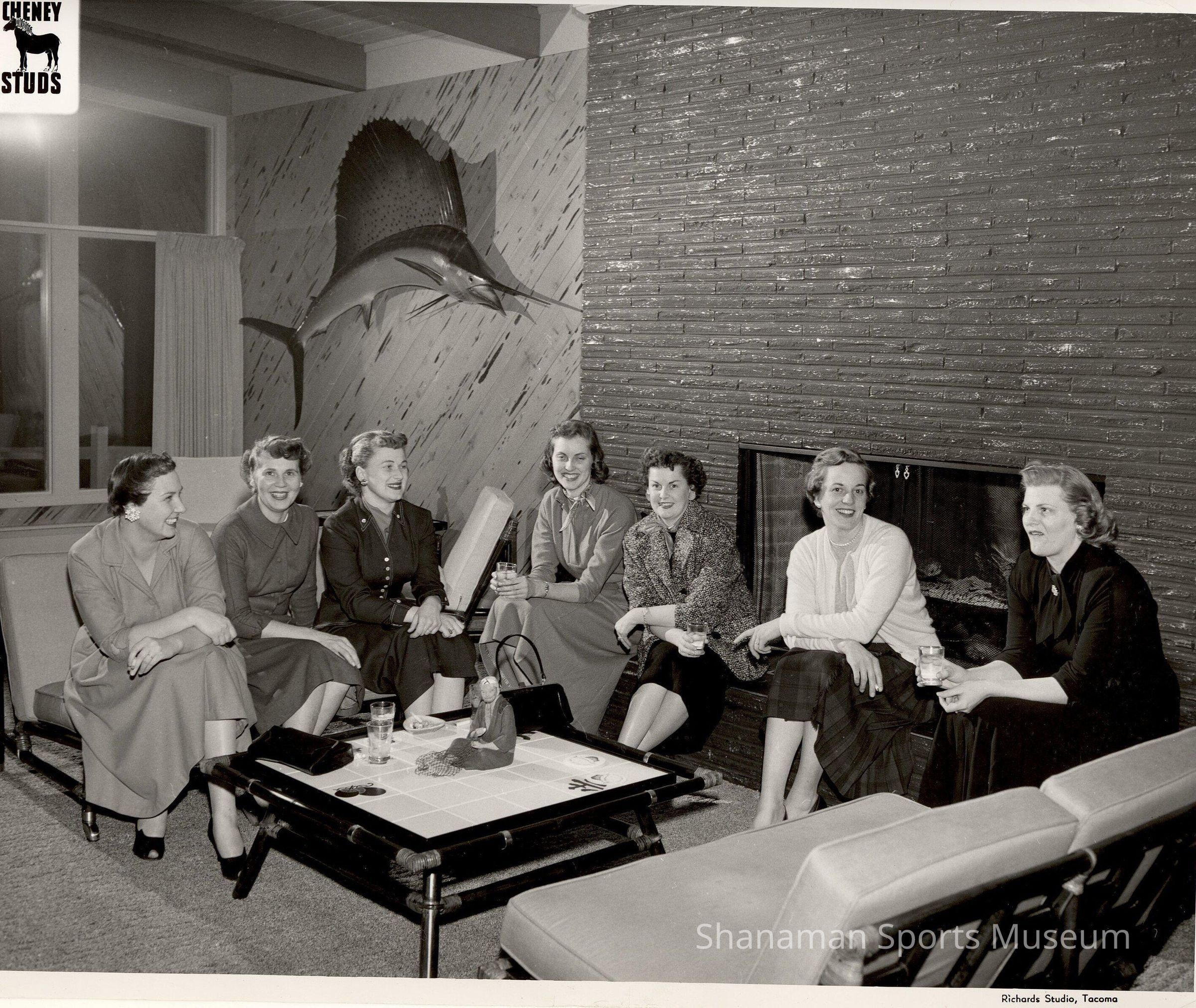 Original candid photo, Cheney Studs basketball players, their wives and others at a social gathering at the home of Ben Cheney. Shortly after this photo was taken, Marv Harshman left coaching at Pacific Lutheran College to coach at WSU.