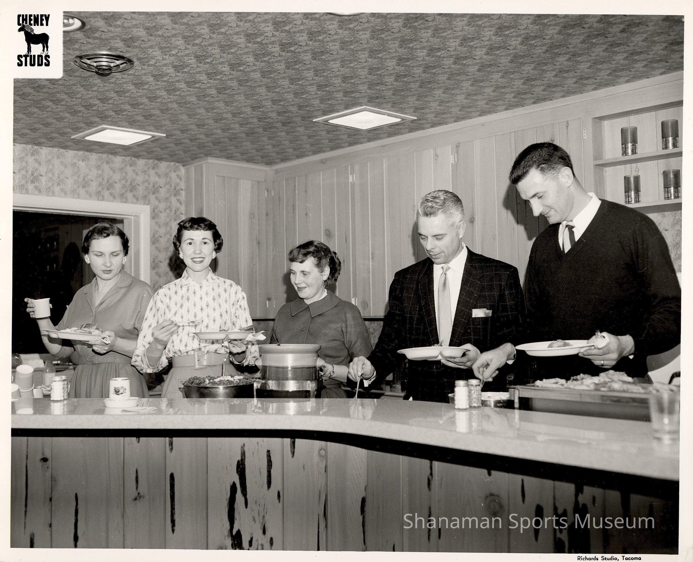 Original candid photo, Cheney Studs basketball players, their wives and others at a social gathering at the home of Ben Cheney. Shortly after this photo was taken, Marv Harshman left coaching at Pacific Lutheran College to coach at WSU.