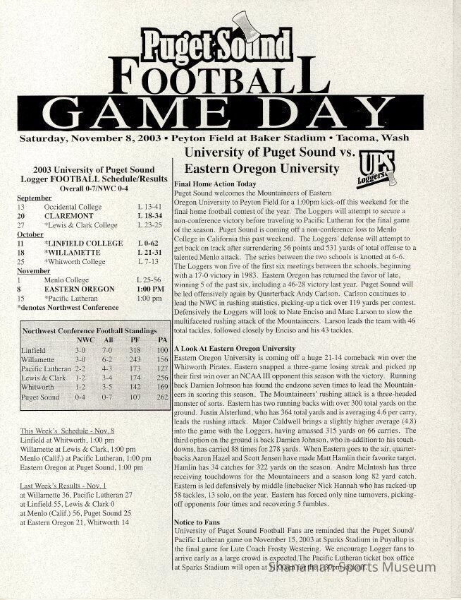 Program, football, UPS vs. Eastern Oregon, Nov. 8, 2003.Archive Details