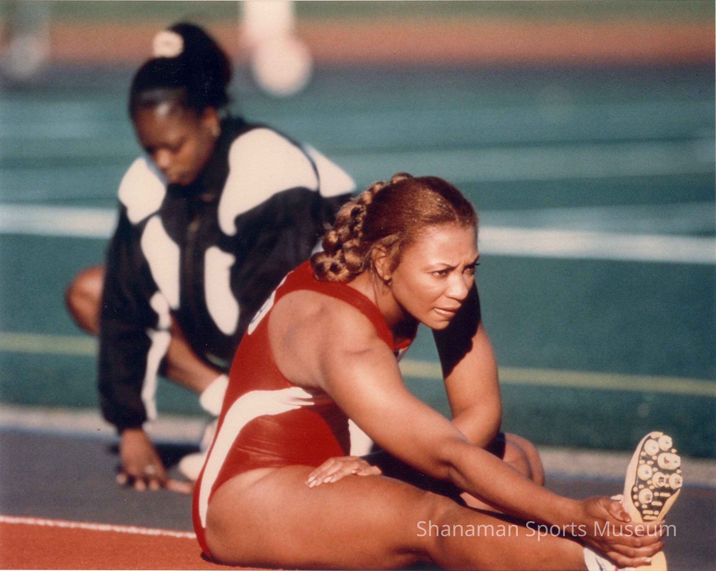 Photo, color, Donna Dennis in red uniform, on ground streching leg, woman in black jacket in background.