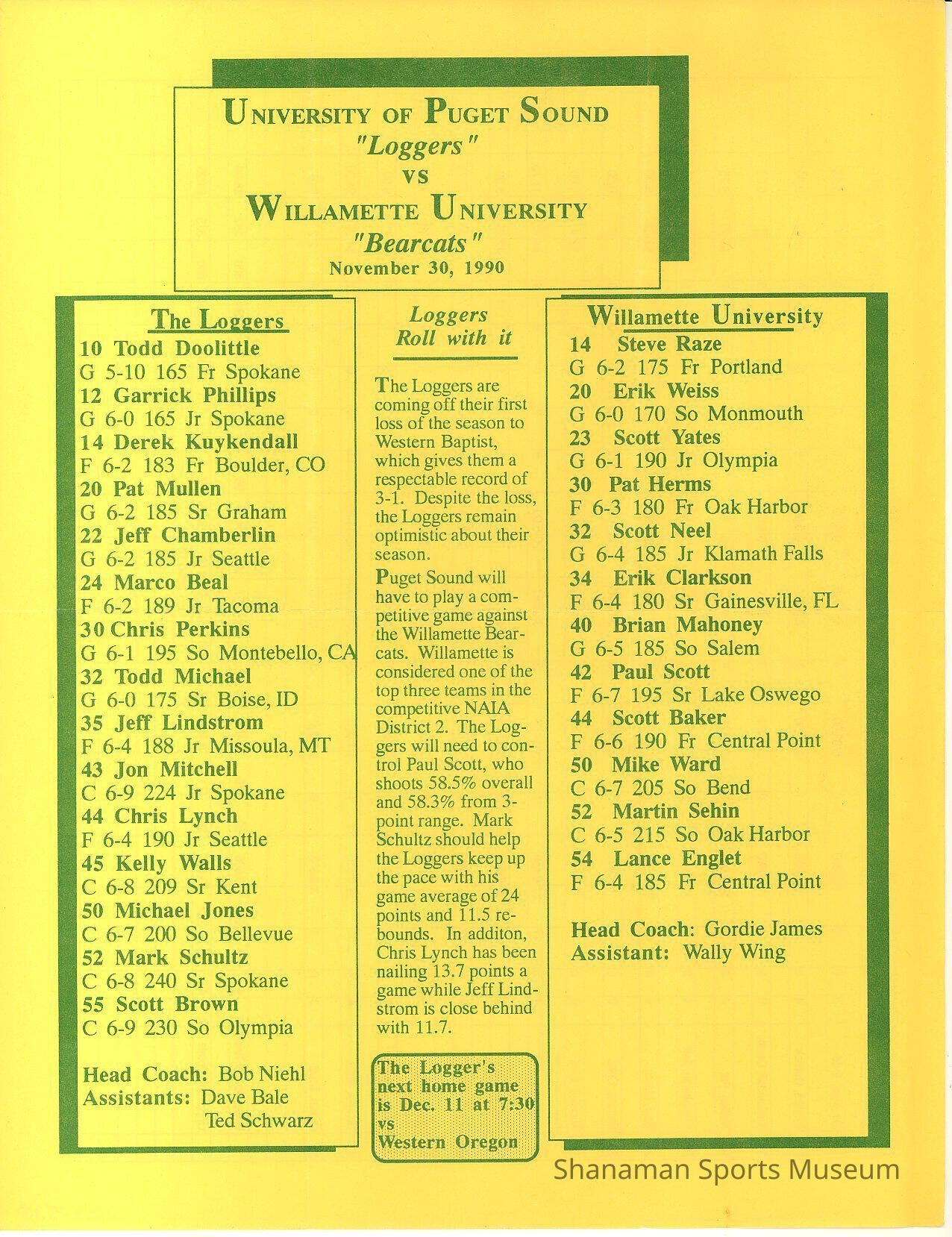 Program, basketball, mens, UPS vs. Willamette University, Nov. 30, 1990.Archive Details