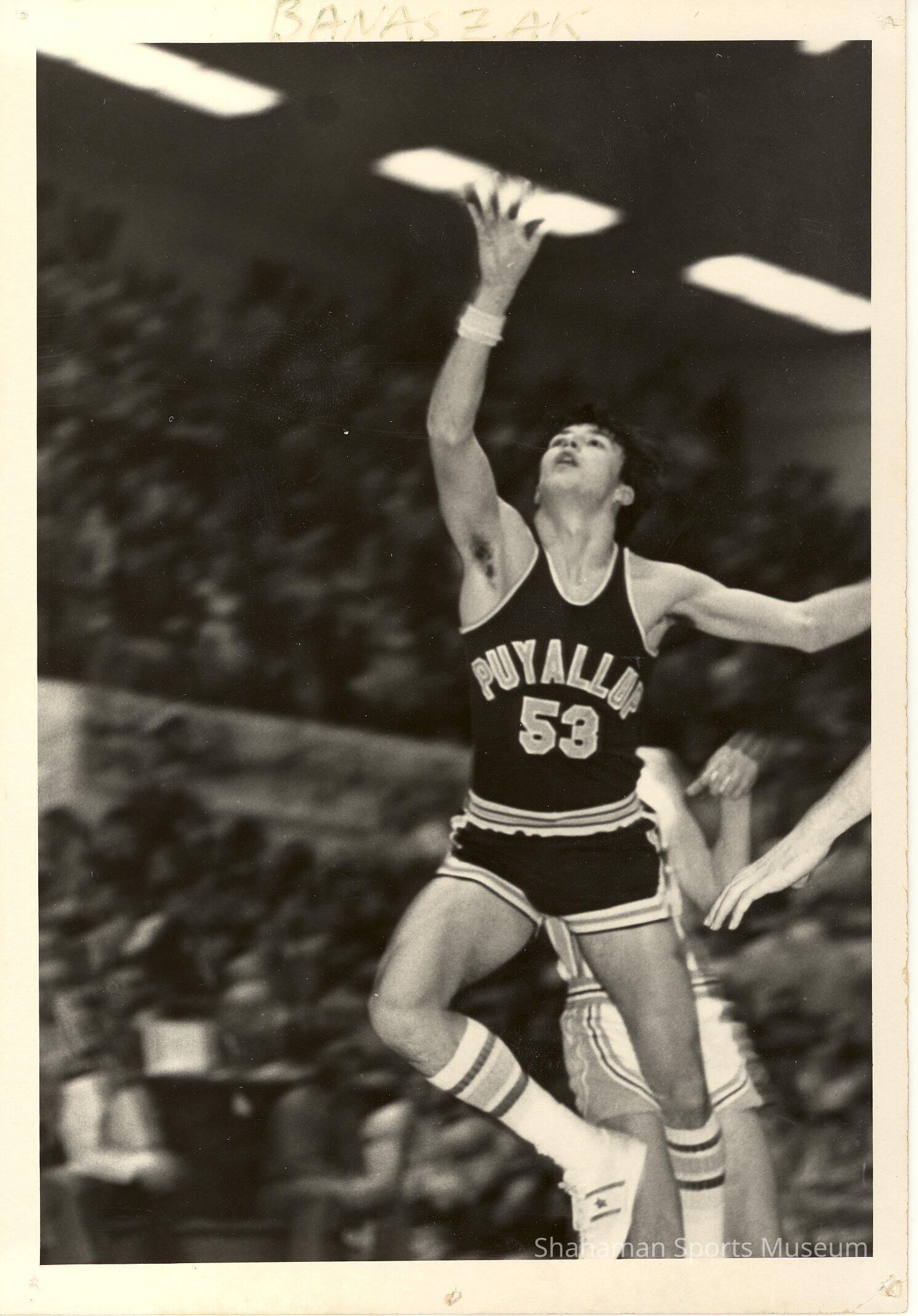 Tony Banaszak of Puyallup High School skies toward the basket, apparently taking a shot, in this action photo likely from the early 1970s. At one time, Banaszak's 19 rebounds against Jefferson High School of Federal Way during the 1972-73 season was among the top-10 records at Puyallup.Lexicon