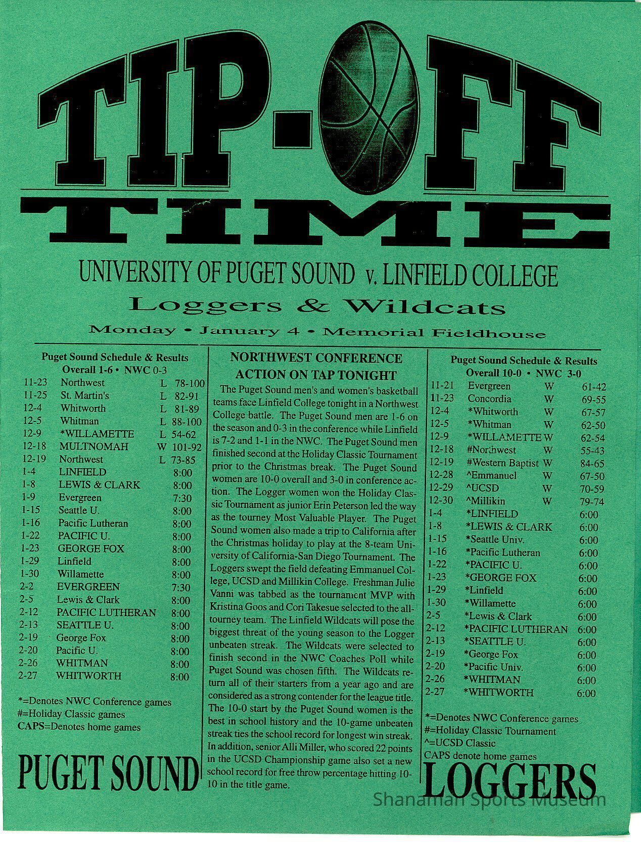 Program, basketball, UPS vs. Linfield College, Jan. 4, 1999.Archive Details