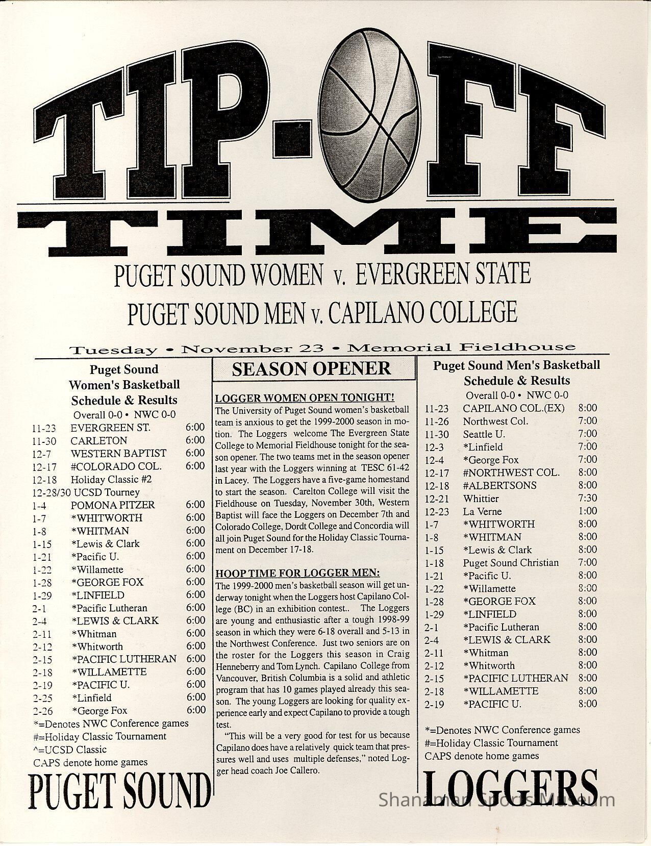 Program, basketball, UPS vs. Evergreen State and Capilano College, Nov. 23, 1999.Archive Details