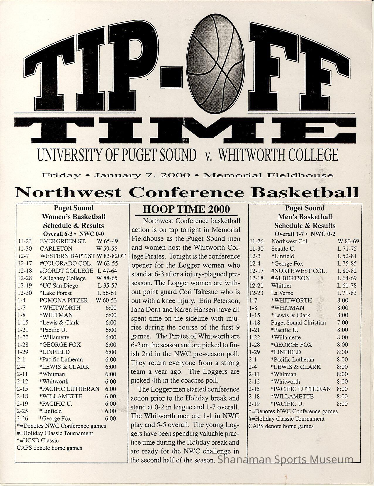 Program, basketball, UPS vs. Whitworth College, Jan. 7, 2000.Archive Details