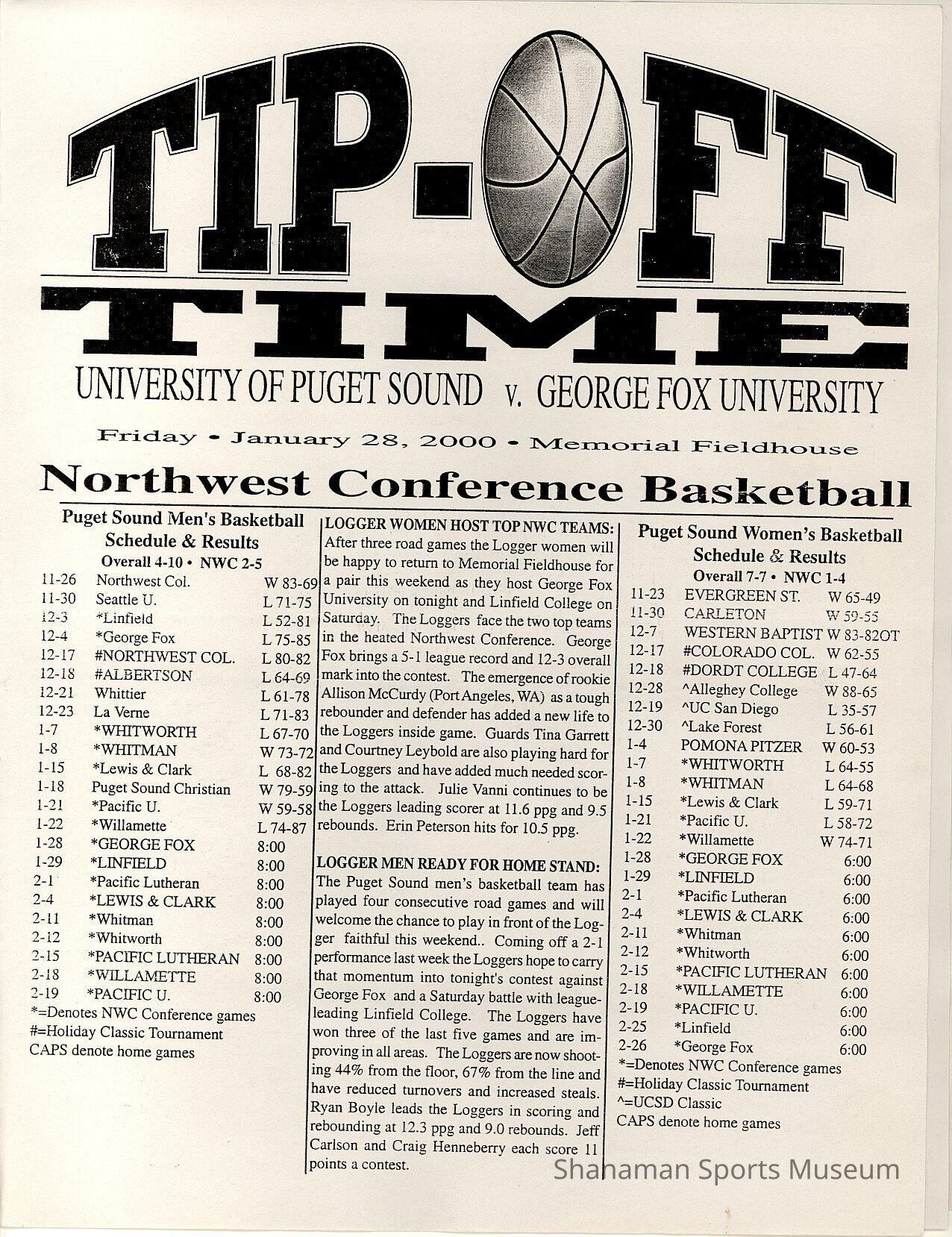 Program, basketball, UPS vs. George Fox, Jan 28, 2000.Archive Details