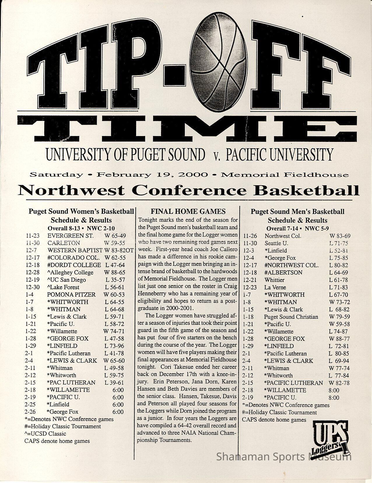Program, basketball, UPS vs. Pacific University, Feb. 19, 2000.Archive Details