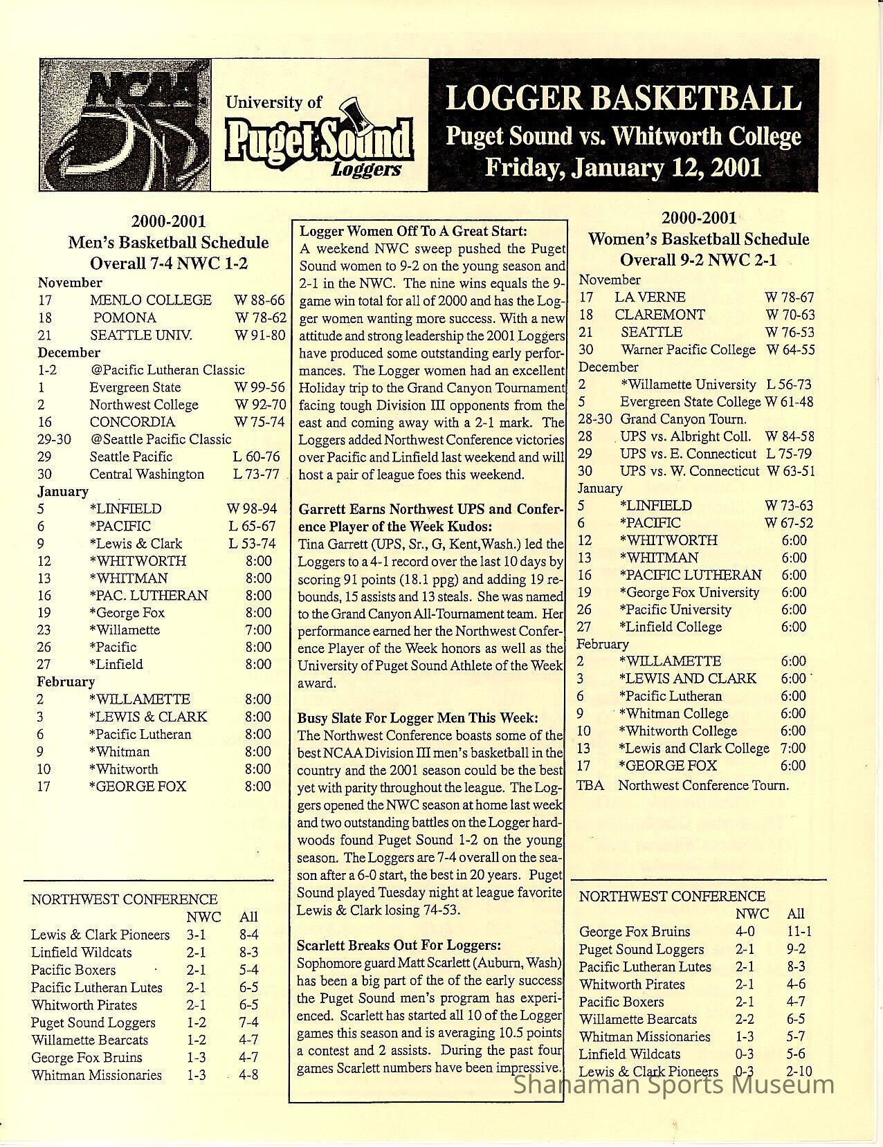 Program, basketball, UPS vs. Whitworth College, Jan. 12, 2001.Archive Details
