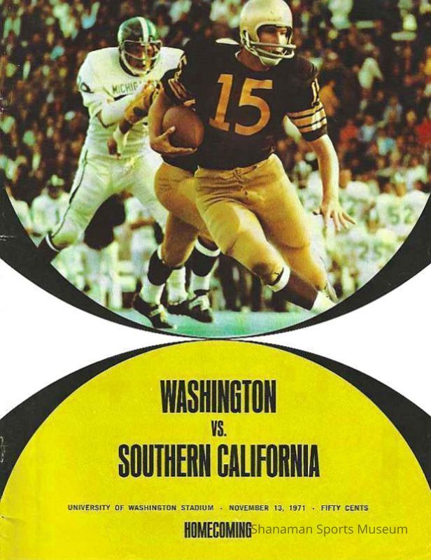 A football program from the University of Washington (UW) vs Southern California, November 13, 1971. At the University of Washington Stadium. From the Husky Sideliner (official UW football magazine).Lexicon
