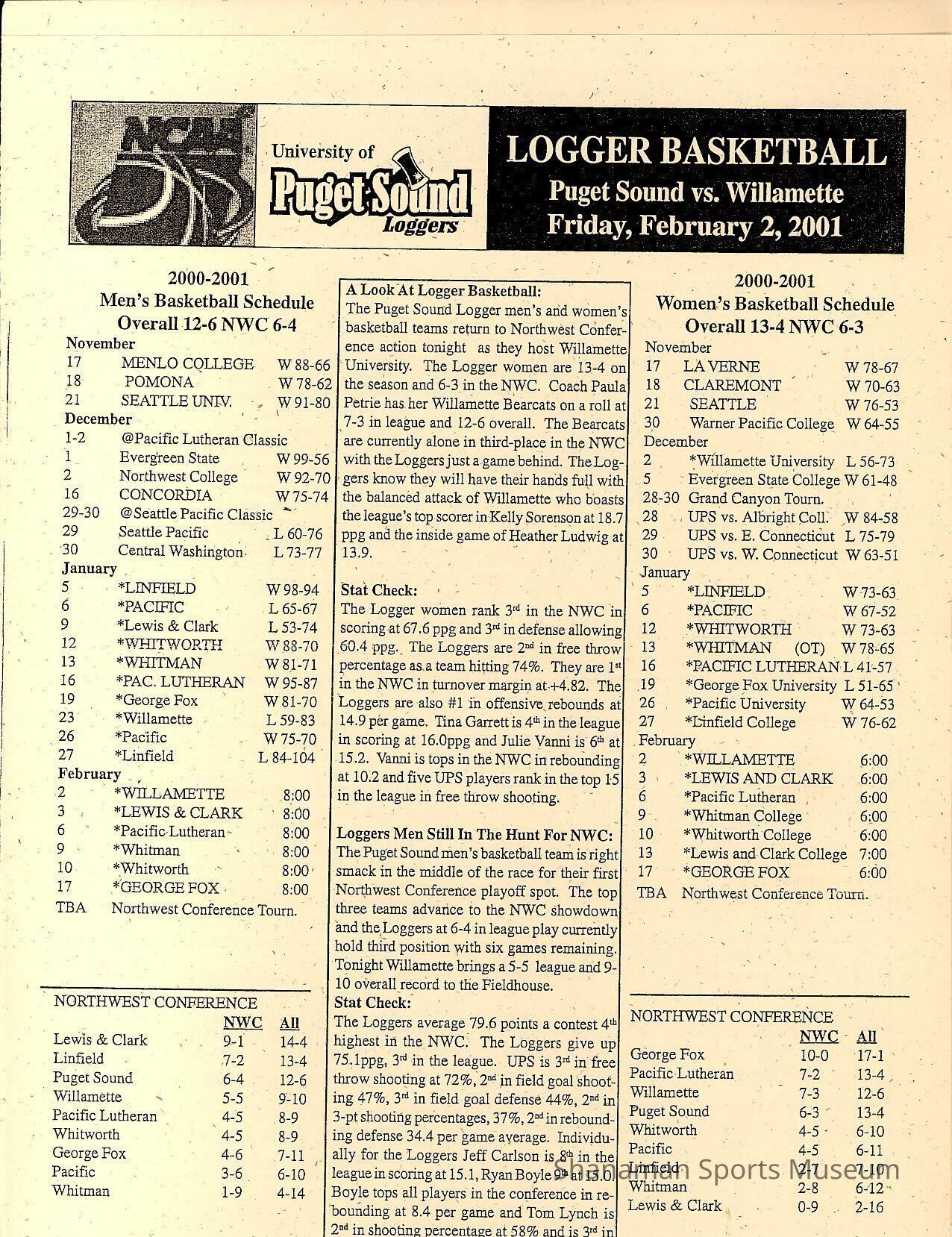 Program, basketball, UPS vs. Willamette, Feb. 2, 2001.Archive Details
