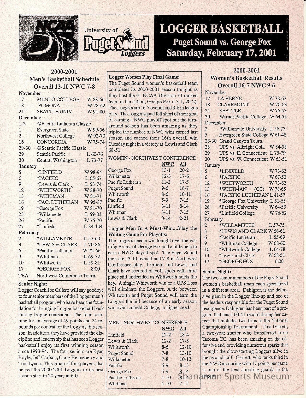 Program, basketball, UPS vs. George Fox, Feb. 17, 2001.