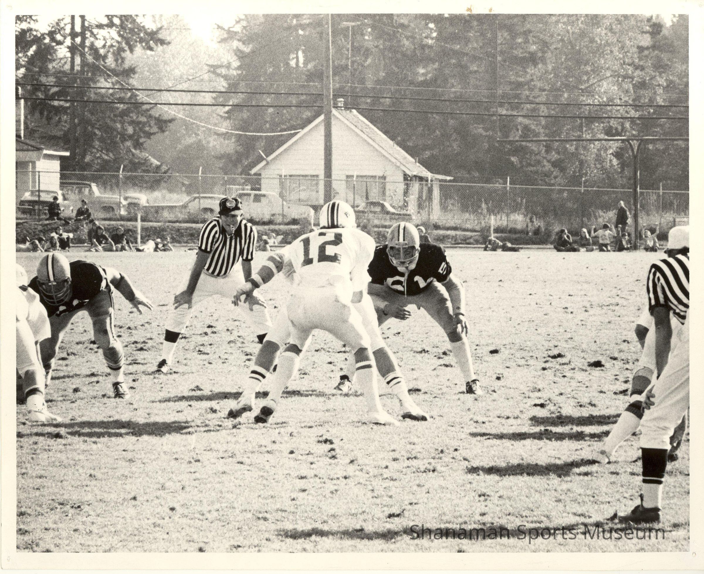 A black and white photograph of a local football game with Rich Hammermaster, white jersey No. 12, lining up at quarterback under center while an unknown defensive lineman and official look on. Known as “the Hammer” for his crushing blocks that led the Puyallup native to be recognized as one of the top offensive linemen to come out of the area where he was selected as an all-star center out of the Puget Sound League. After graduating from Puyallup High School in 1953, Hammermaster went on to play football at the University of Washington (1953-1955) and finished his college career playing for the College of Puget Sound (1955-1958). He also played basketball and tennis for both Puyallup High School and the University of Puget Sound. He played two seasons of basketball with UPS (1954-1956) and was a player and coach of the Loggers tennis team in 1958. He went on to both serve in the United States Air Force where he was stationed at Hamilton Air Force Base; while there he played three seasons from 1958-1960. After his service, Hammermaster returned back to his hometown where he began teaching at Puyallup High School while also coaching both the tennis and boys basketball teams while working as an assistant coach on the Vikings football team under head coach Bob Ryan. He coached the Vikings basketball team for 15 years, coaching Puyallup High School to a state title in 1971, while winning the league title six times.Lexicon