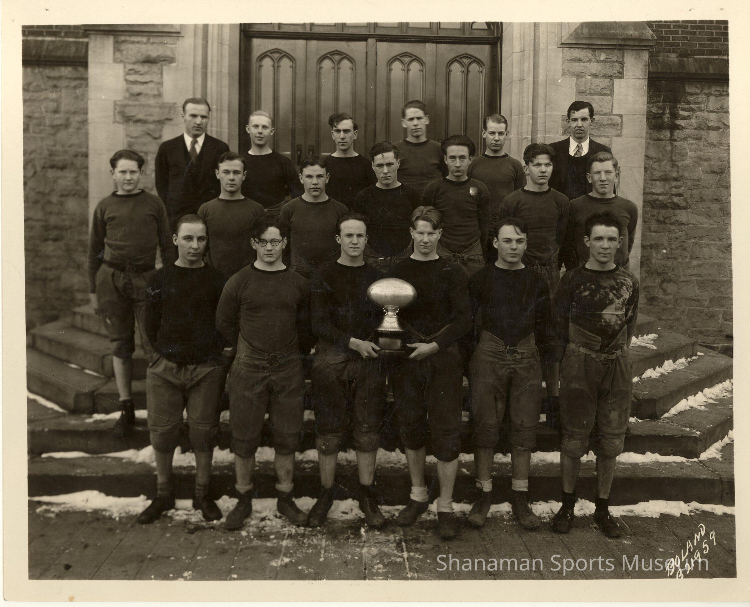 Two members of the Lincoln High School football team hold a trophy for a team photo, believed to have been taken in 1931.Made/Created