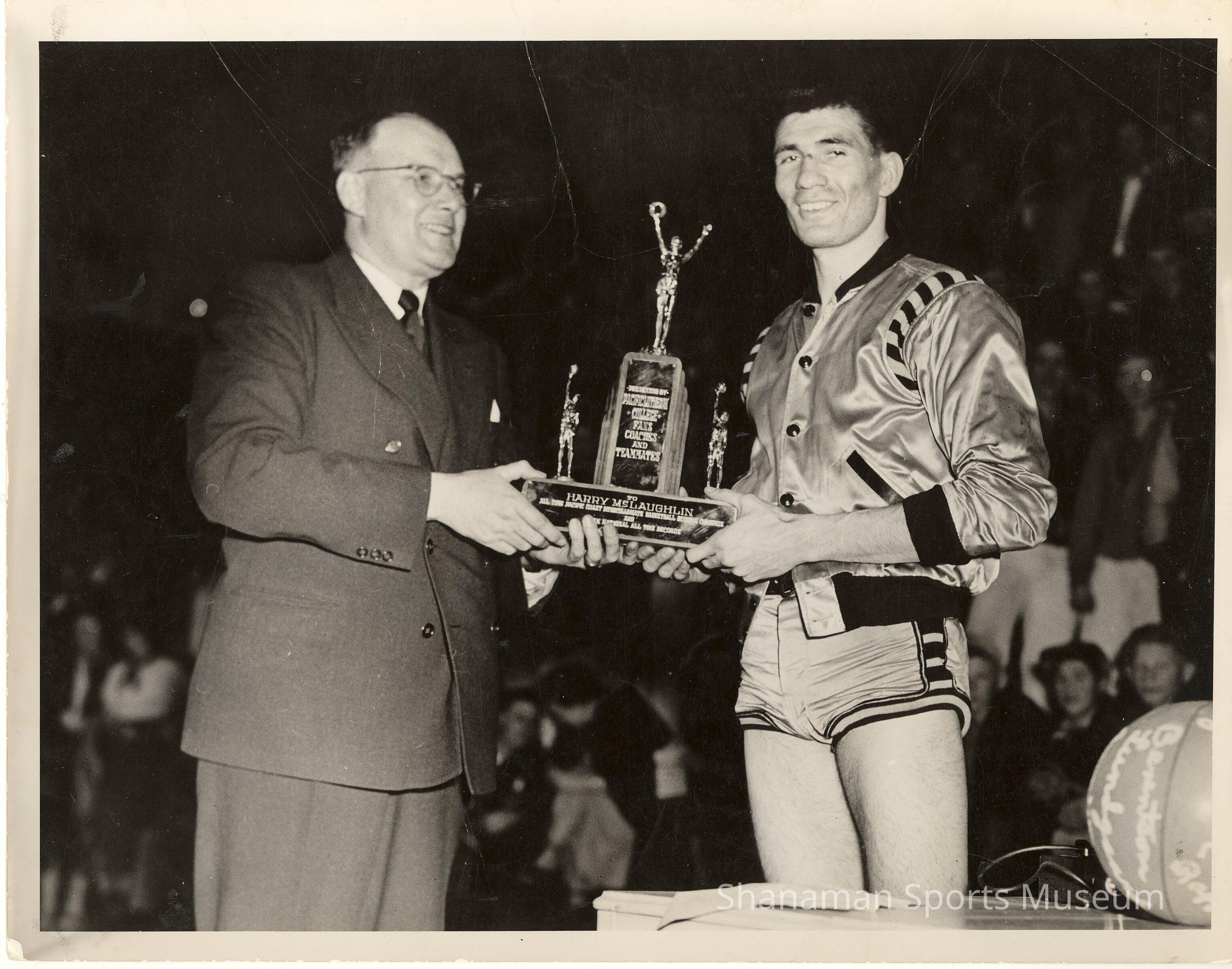 Harry McLaughlin receives a trophy in this undated photo from his career with Pacific Lutheran College, which ended in 1950. McLaughlin was inducted into the PLU Hall of Fame in 1994 following a career where he teamed with young coach Marv Harshman to turn the Gladiators into a solid program after returning to basketball competition following World War II. He led the team to a 24-7 record in his junior season. McLaughlin was an aggressive player known for attacking the rim and getting to the free-throw line in an era where hard-nosed play was not the norm. McLaughlin, who would go on to play for the Jewish barnstorming team House of David, was reportedly the first player Harshman ever saw dunk the basketball.Lexicon