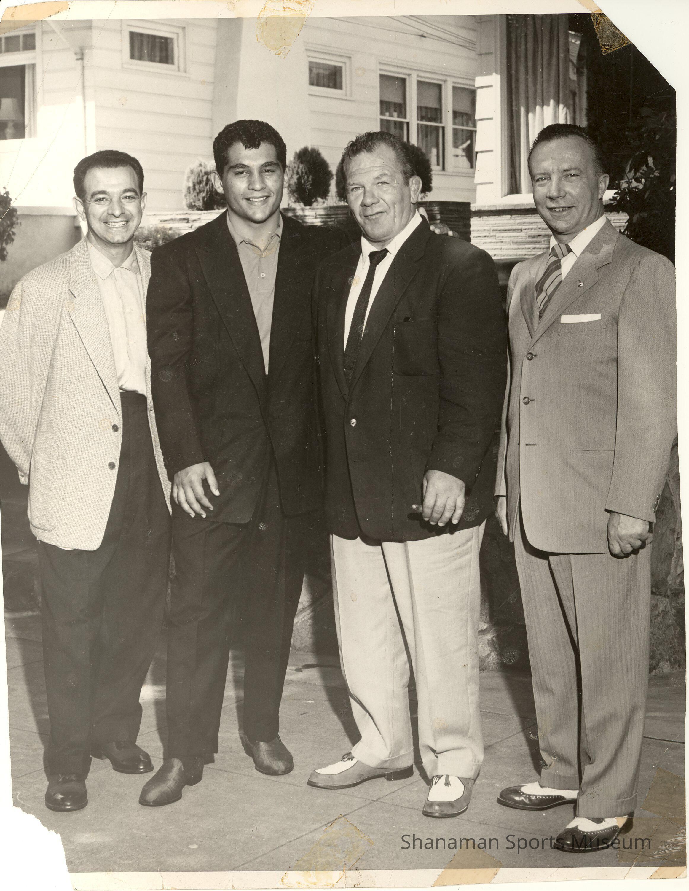 Manager Angelo Dundee, far left, standing next to Willie Pastrano, Paavo Keteneu and Inigo Luccehsi. Pastrano fought Tacoma's son "Irish" Pat McMurtry at the Lincoln Bowl in Tacoma, Washington on August 24, 1956. Pastrano defeated McMurtry in front of a crowd of 11,000 spectators.Lexicon