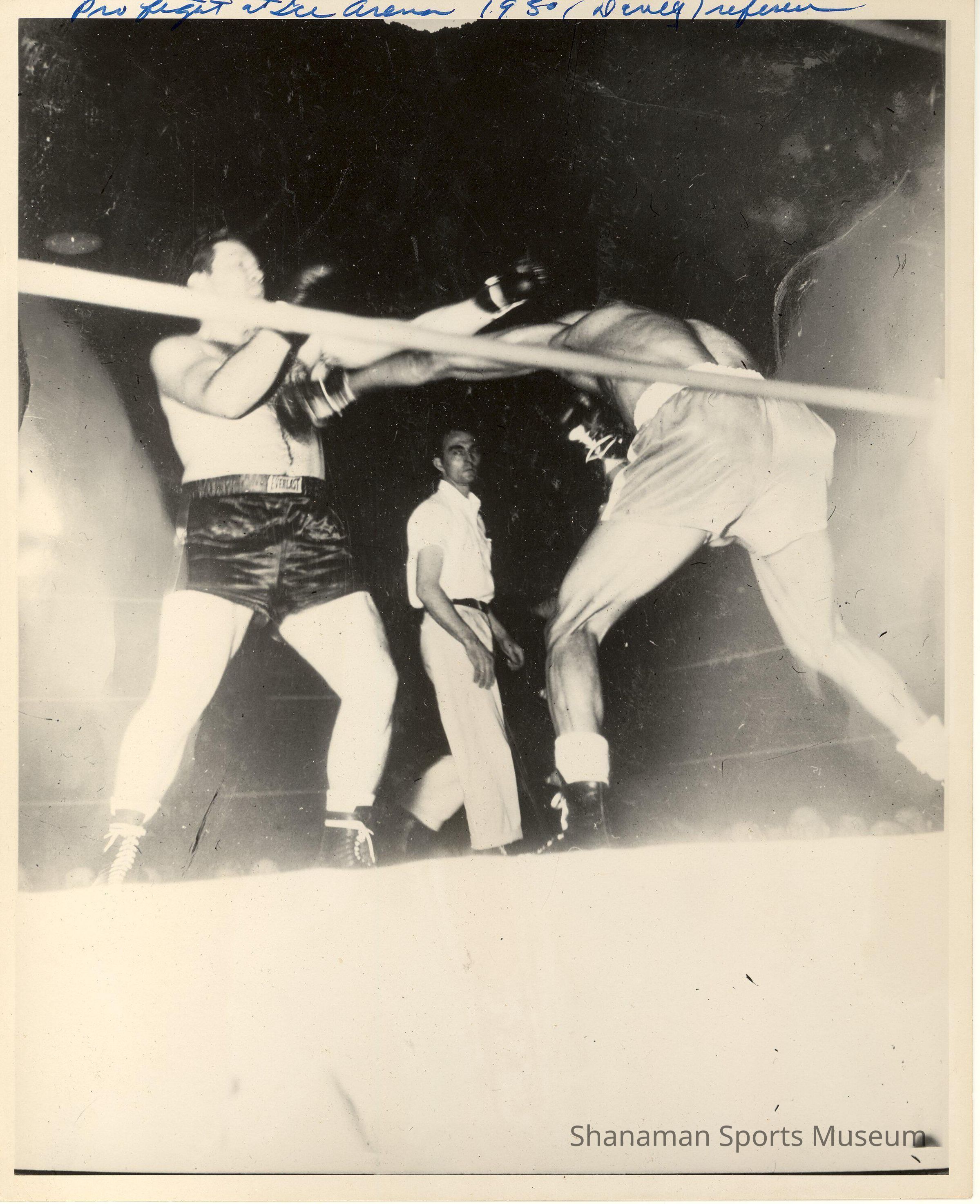 Referee Davey Ward, center, officiates a boxing match estimated to be between 1928-32.Lexicon