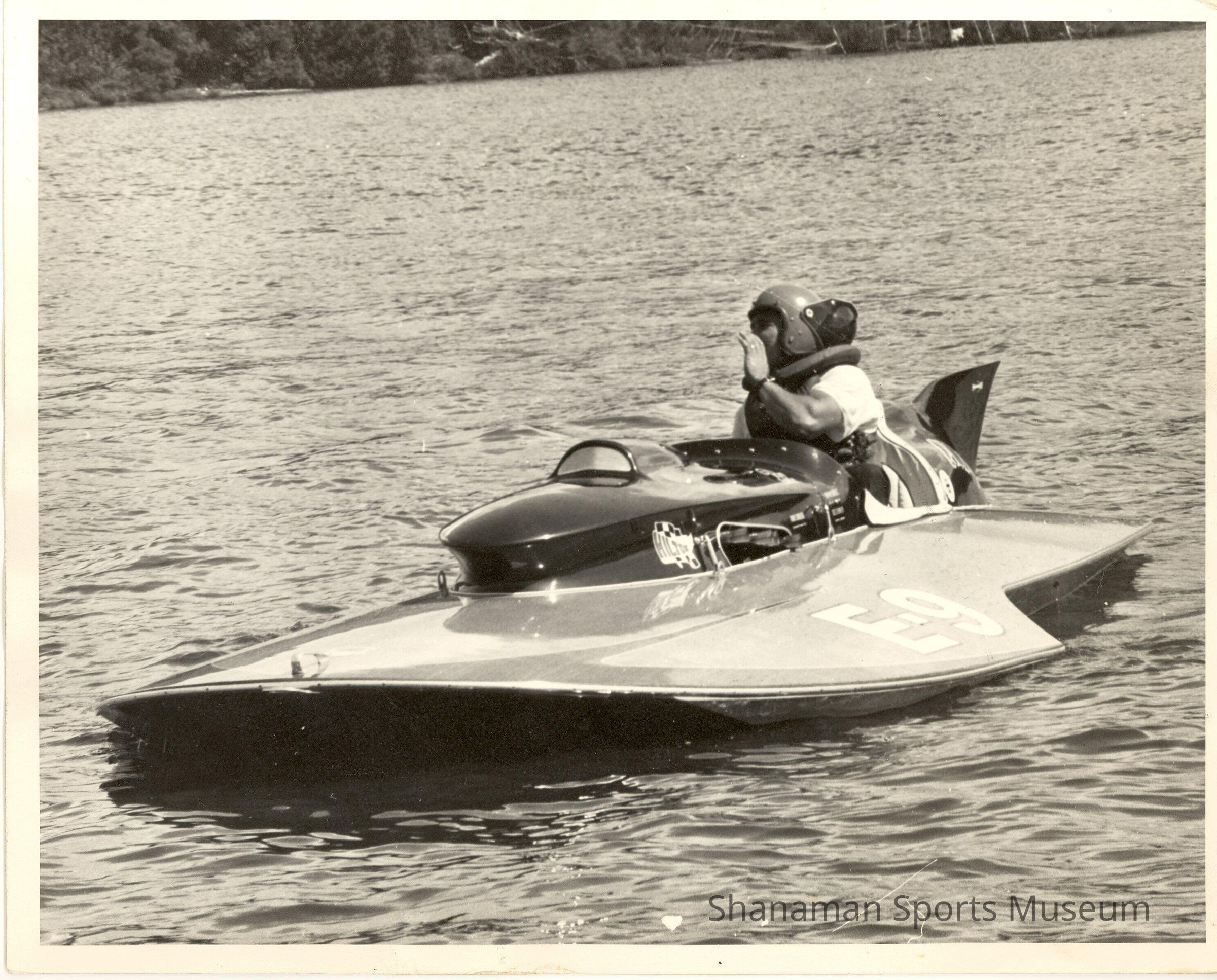 In this black-and-white photo taken in 1965, George Henley sits in his 280 class hydroplane, Calypso, ready to begin racing. After graduating from Eatonville High School in 1954, Henley started his stellar boat racing career in 1955 racing outboards. His 20-year racing career was capped by winning back-to-back national championships while racing the famous PayNPak in 1974 and 1975. He had a successful 1974 season of racing. He became the first unlimited hydroplane driver to win seven High Point Races in a single season. Following the President's Cup that year, he and his team met with President Gerald Ford.Lexicon