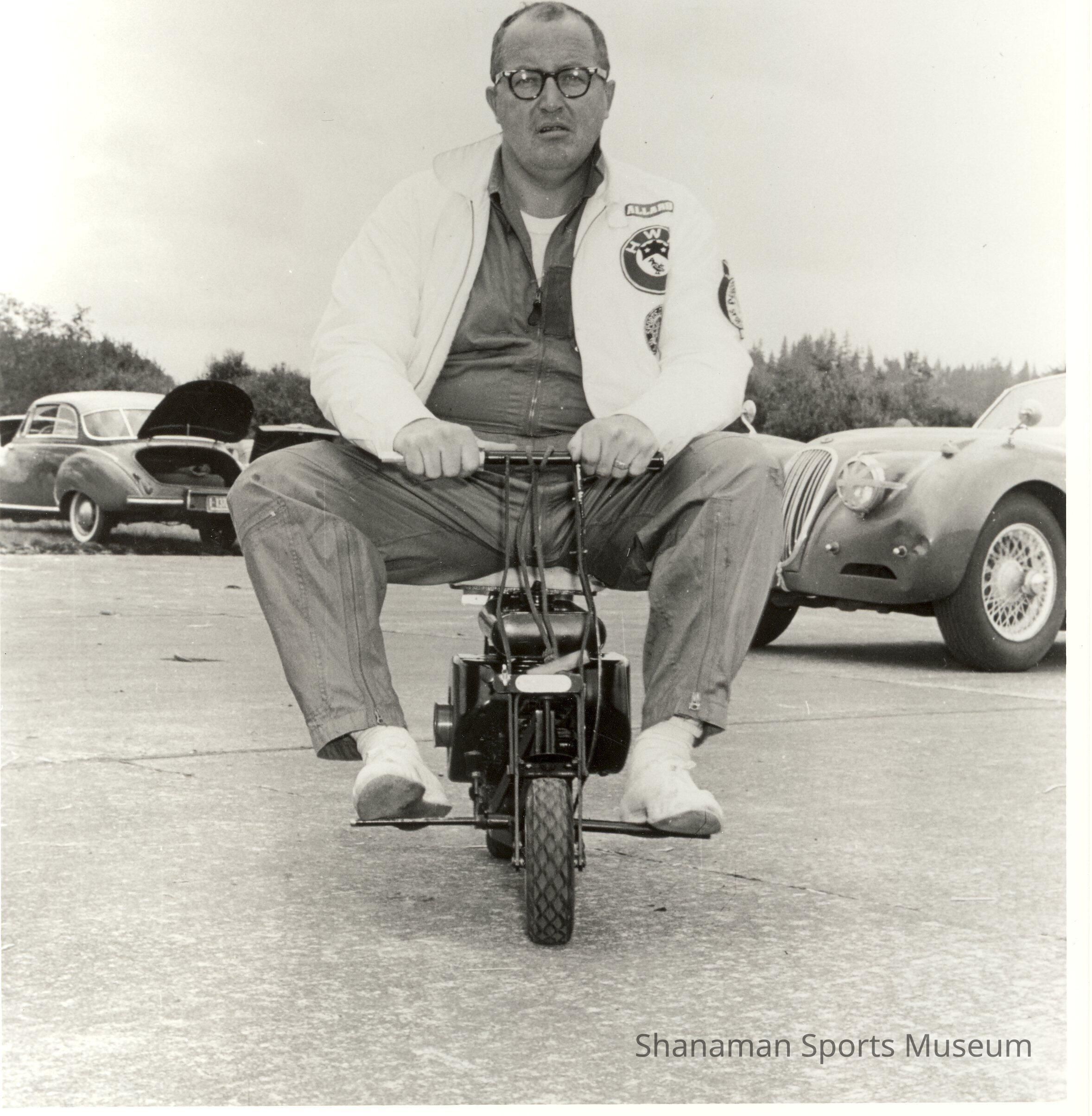 Tom Carstens, a Tacoma car dealer, rides a tiny motorcycle. Carstens was a motorsports enthusiast who sponsored a Midget (small versions of Indy cars) racing team and served as the first executive of the Northwest Region of the Sports Car Club of America. He was on the crew of the “City of Tacoma Special” car driven by Hal Cole to a sixth-place finish at the 1948 Indianapolis 500. Carstens drove in vintage car races in the 1970s. He attended Bellarmine Prep and the University of Puget Sound. He died in 1996 at the age of 83.Lexicon