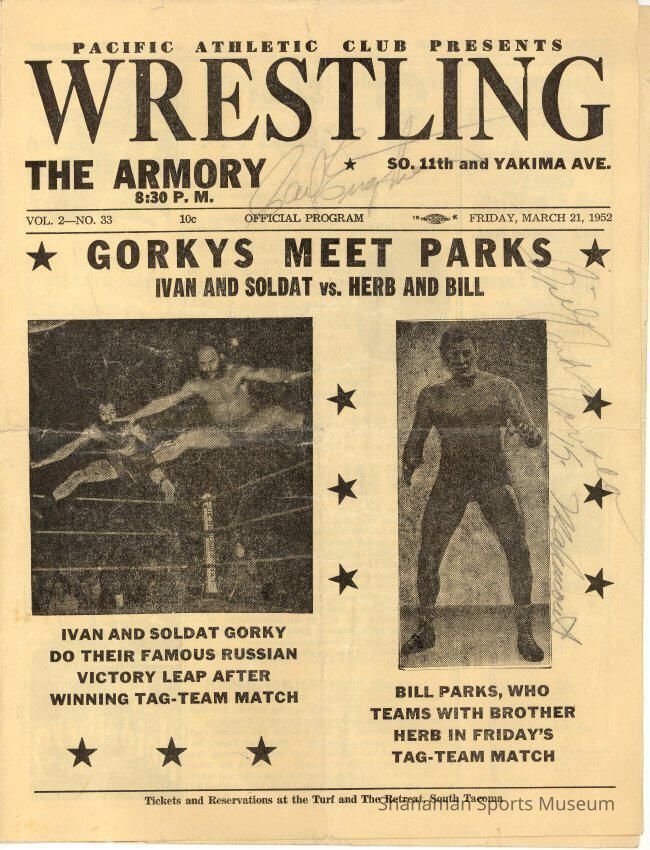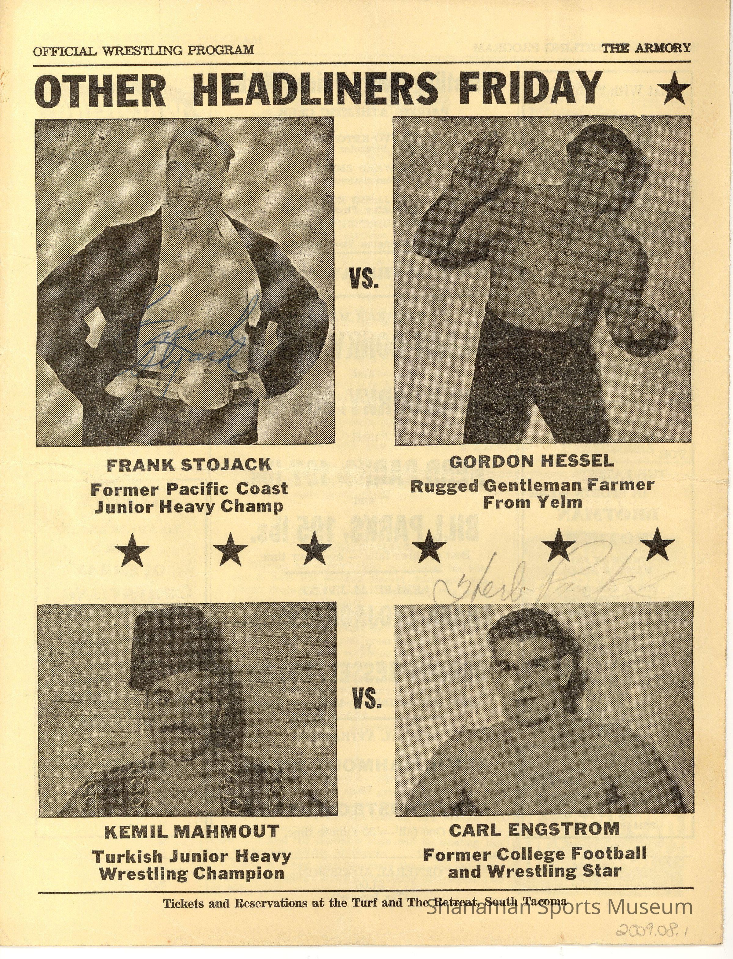 Program for Wrestling Event at the Tacoma Armory March 21, 1952. Frank Stojack vs. Gordon Hessel one ofthe matches.