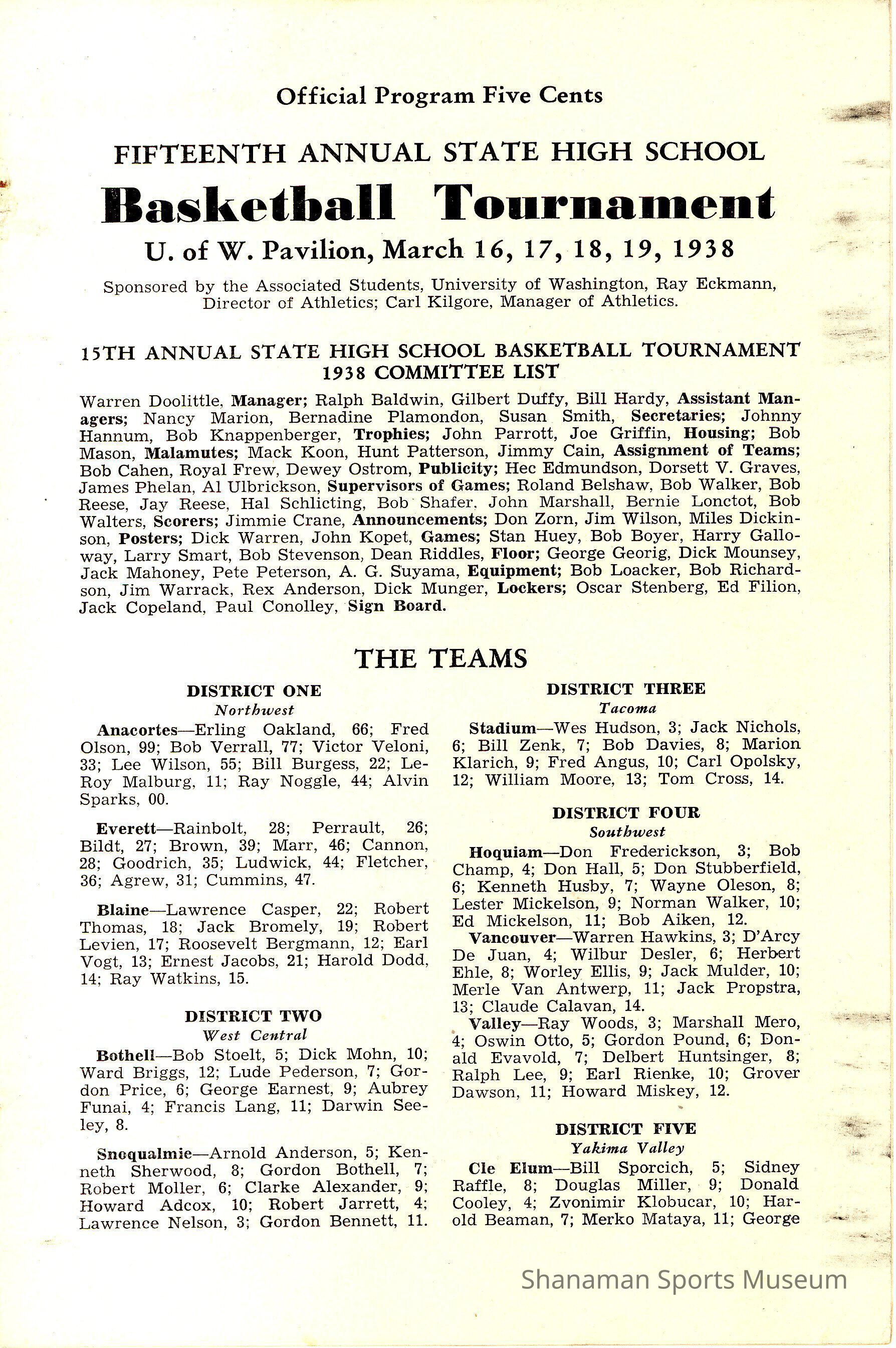 Program, 15th Annual State High School Basketball Tournament, March 16-19, 1938. Stadium High School participated.Relationships