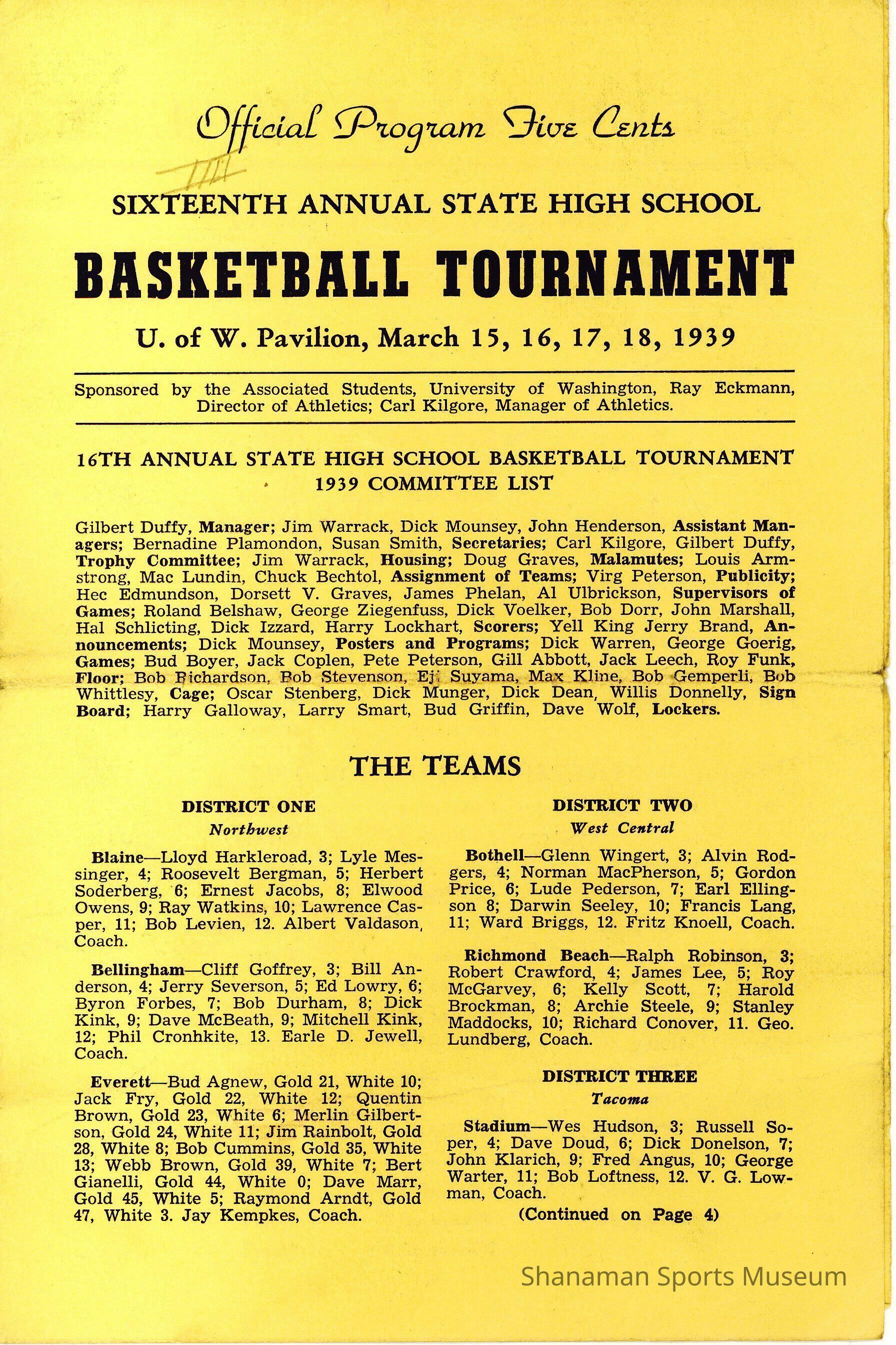 Program, 16th Annual State High School Basketball Tournament, March 15-18, 1939. Stadium High School participated.Relationships