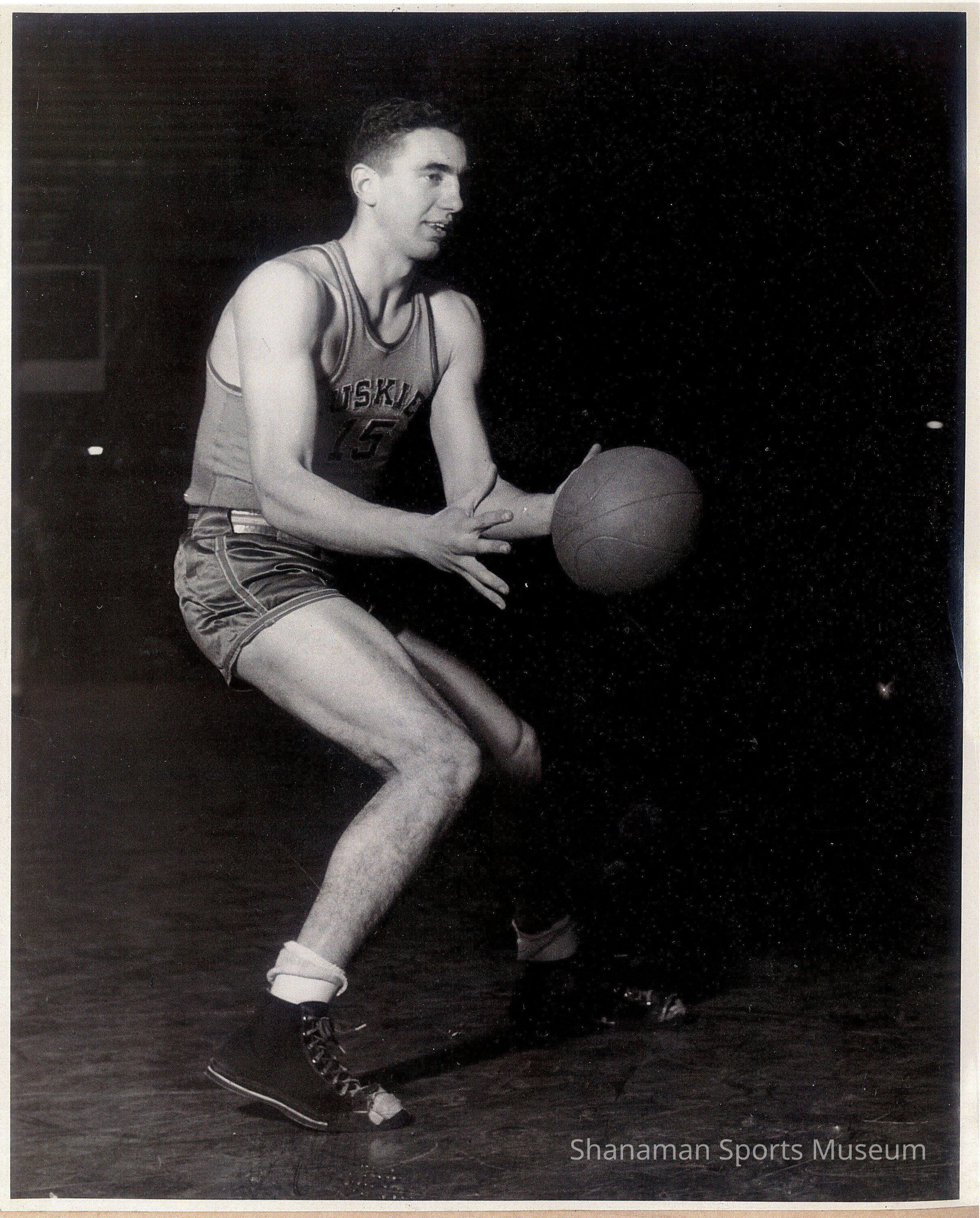 Wearing jersey #15, Chuck Gilmur was a star for the Washington Huskies in the early 1940s when his 6-4 height was considered tall, the set shot was the prevailing style and field goal shooting in the 30 percent range was considered good. A child of Seattle, Gilmur later taught and coached for decades in Tacoma.Lexicon