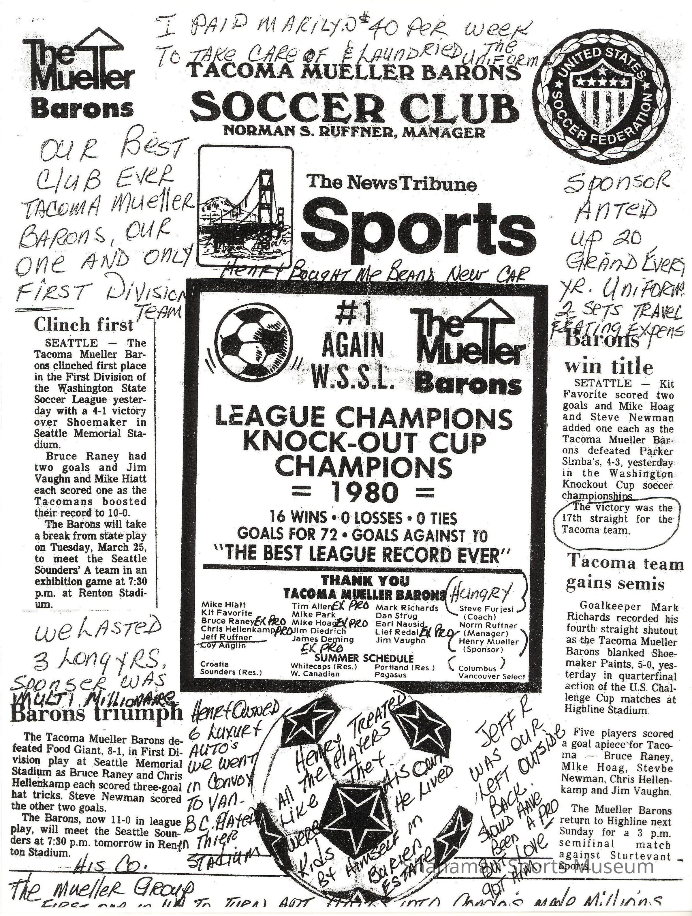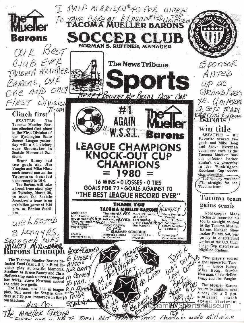 Several newspaper articles about the Tacoma Mueller Barons soccer club are displayed circa 1980.