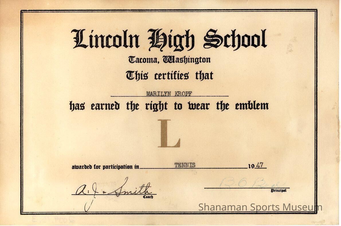 Varsity Letter cerificate awarded to Marilyn Kropf for tennis in 1947.Relationships