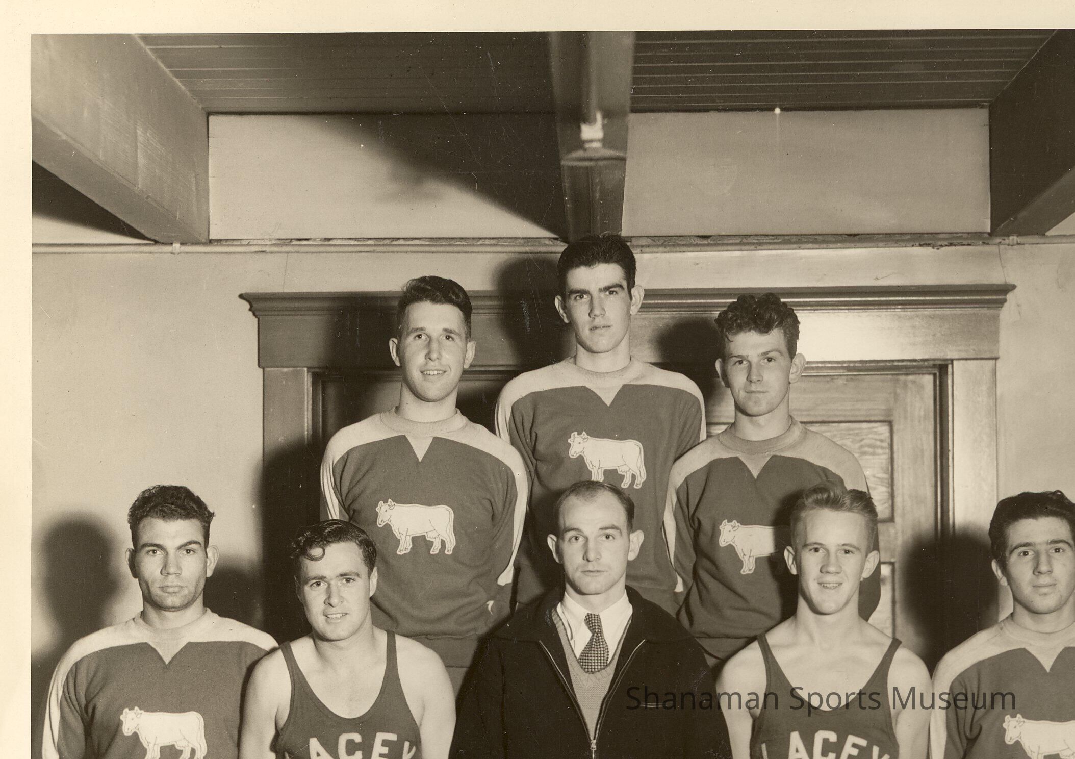 Jerry Geehan, bottom row, second from left, is featured in this undated photo of the Lacey Dairy basketball team, one of many successful semi-professional community teams of the era. Geehan likely played for Lacey Dairy following his graduation from Lincoln High School in 1930, after which he set out on a career that would see him be one of the area’s foremost broadcasters and in which he helped launch the careers of several other area legends, including Clay Huntington, Rod Belcher, Doug McArthur, Bob Robertson, Don Hill, Art Popham and Bill O'Meara. After attending the College of Puget Sound for two years, Geehan began his career at KVI and would later become the first broadcaster for the Tacoma Tigers of the Western International League. Geehan would later become owner and general manager of the venerable Tacoma station KTAC from 1952-69 and was Chairman of the Board of the Washington State Association of Broadcasters. Jerry and Delores Geehan were married 62 years and had one daughter, Victoria Loney Shilley.Lexicon