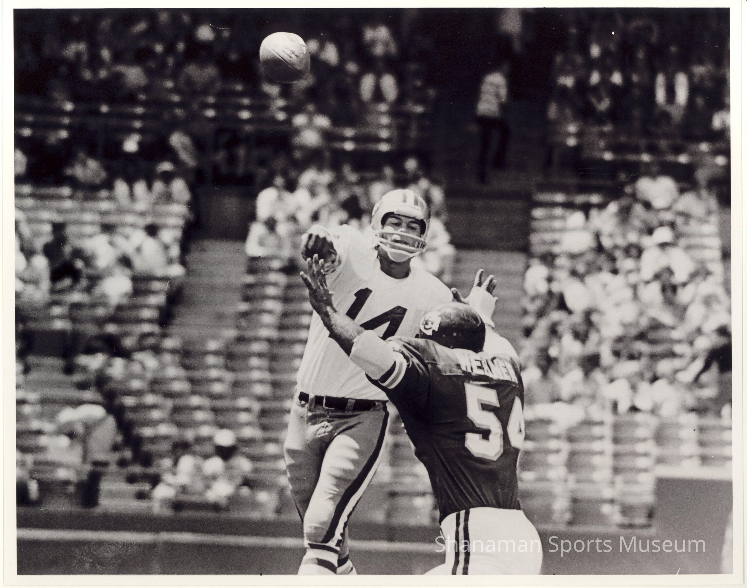 Clyde Werner, a 1966 graduate from Wilson High School, rushes San Francisco 49ers' quarterback Jim Plunkett while playing linebacker for the Kansas City Chiefs. After playing football at the University of Washington, Werner was a second-round draft pick by the Chiefs in the 1970 NFL draft. Werner was with the Kansas City Chiefs six seasons. When Werner was playing linebacker for the Huskies, he had 21 tackles in a game against Washington State, setting a team record for most tackles in the Apple Cup.