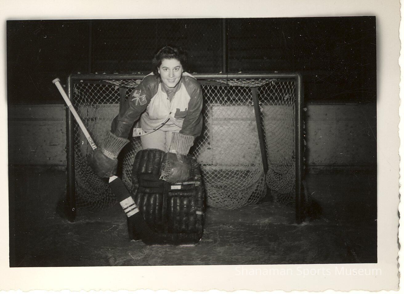 Sports fan Anne Jacksich poses in front of a goal wearing hockey gear at the Lakewood Ice Arena in Tacoma. Hockey was a popular addition to the rink along with skating and a host of other activities for residents in the area during the ice rink’s heyday. The ice arena was the entertainment hub from its opening in 1938 until it 1982 when part of the building collapsed and the rest was demolished.Made/Created