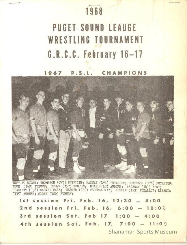 Program- 1968 Puget Sound League Wrestling Tournament, February 16-17, 1968. Photo of 1967 champions on the front.