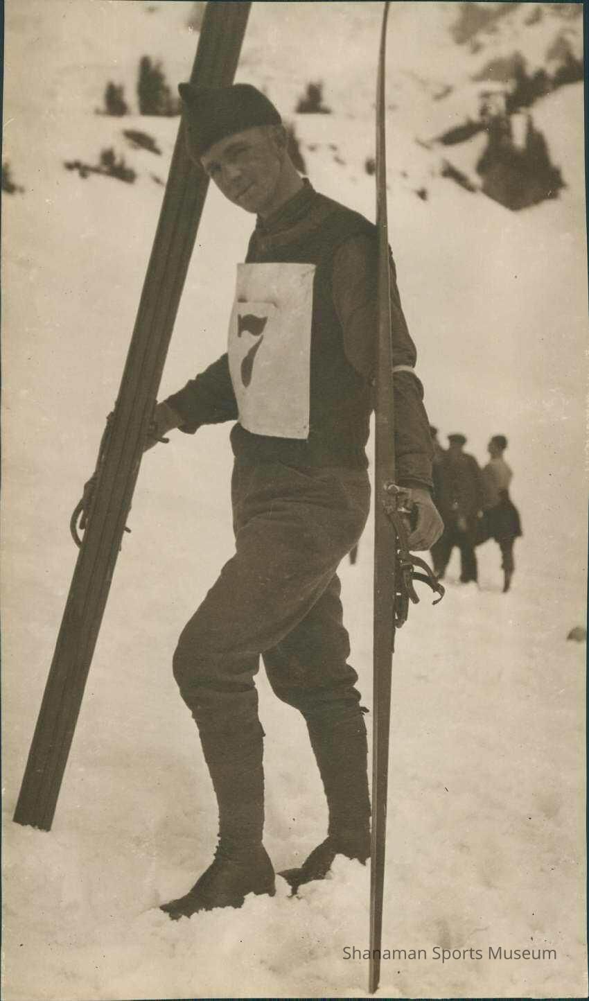 Wearing No. 7 race number on his chest, Sigurd Johnson holds two wooden skies in this photo that was taken around 1915. Johnson, an avid skier, made his own skies, which was a common thing to do back then.
