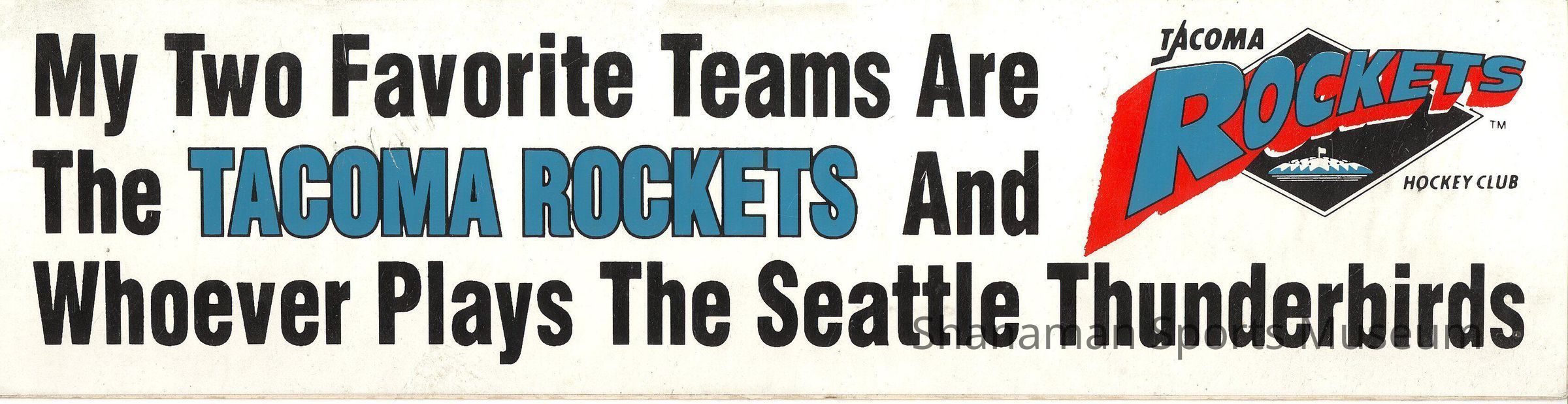 Bumper Sticker- "My Two Favorite Teams Are The Tacoma Rockets and Whoever Plays The Seattle Thunderbirds," Tacoma Rockets Hockey Club, c. 1993.Archive Details