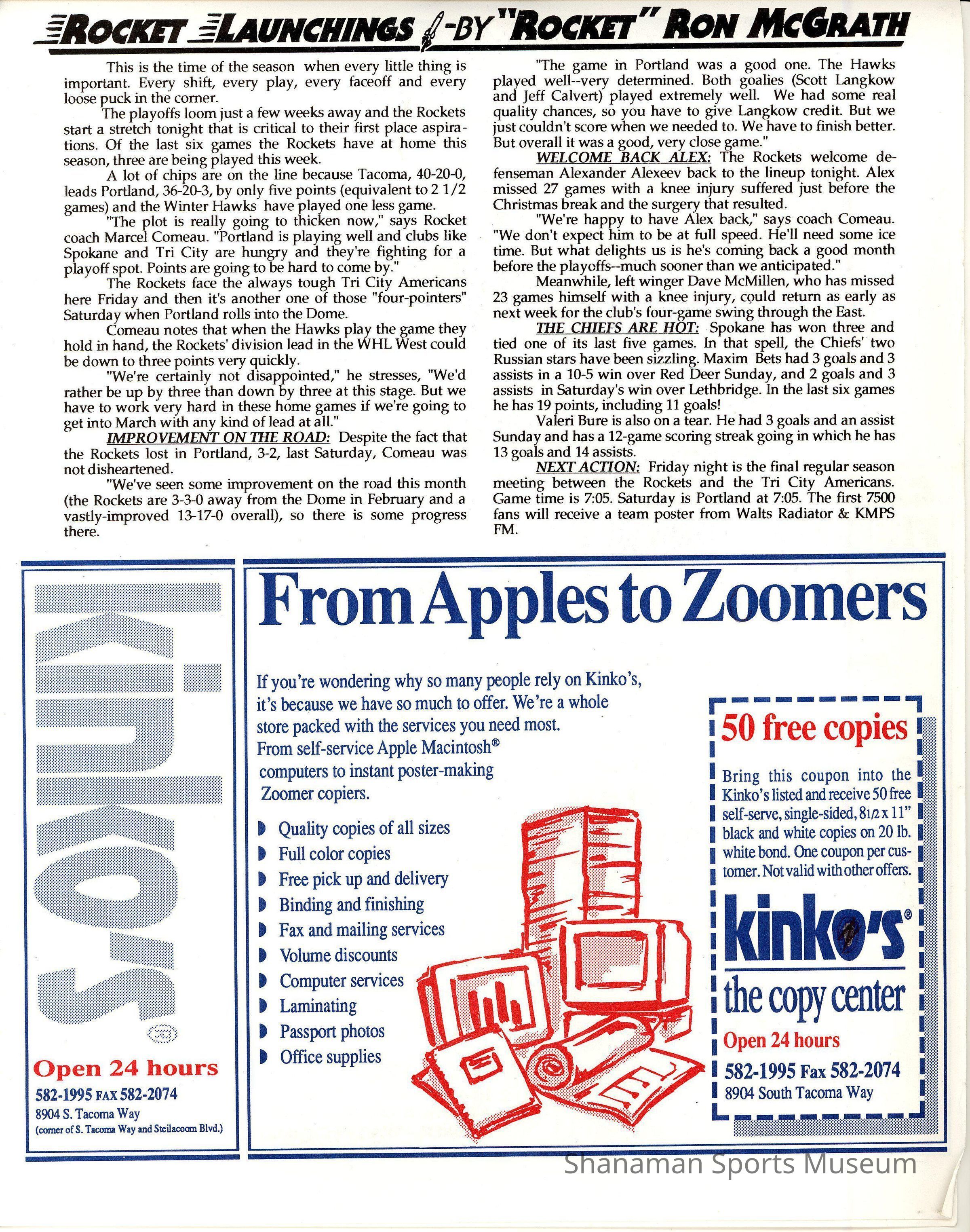 Official Scorecard for the Tacoma Rockets Hockey Club, c. 1993.Archive Details