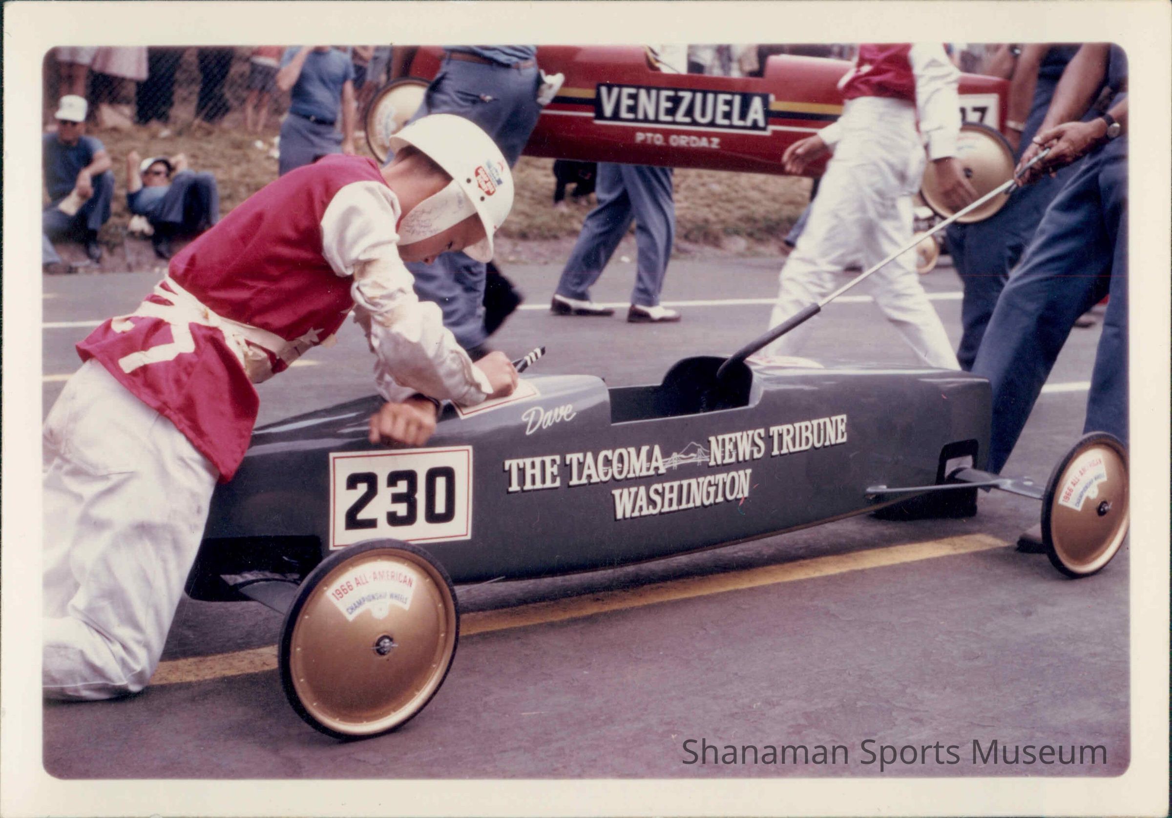 A 12-year-old David Krussow helps put his homemade race car into place at the starting line of the 1966 National Soap Box Derby in Akron, Ohio. For the second time in two years a driver from Tacoma won the race as Krussow cruised to victory as he reached speeds of about 25 mph. Gregory Schumacher of Tacoma won the soap box derby's national championship in 1964. They are the only two qualifiers from Washington to win the championship in the first nine decades of the race. In the late 1950s, race organizers began providing identical wheels to each racer to stop kids from souping up their wheels.Lexicon